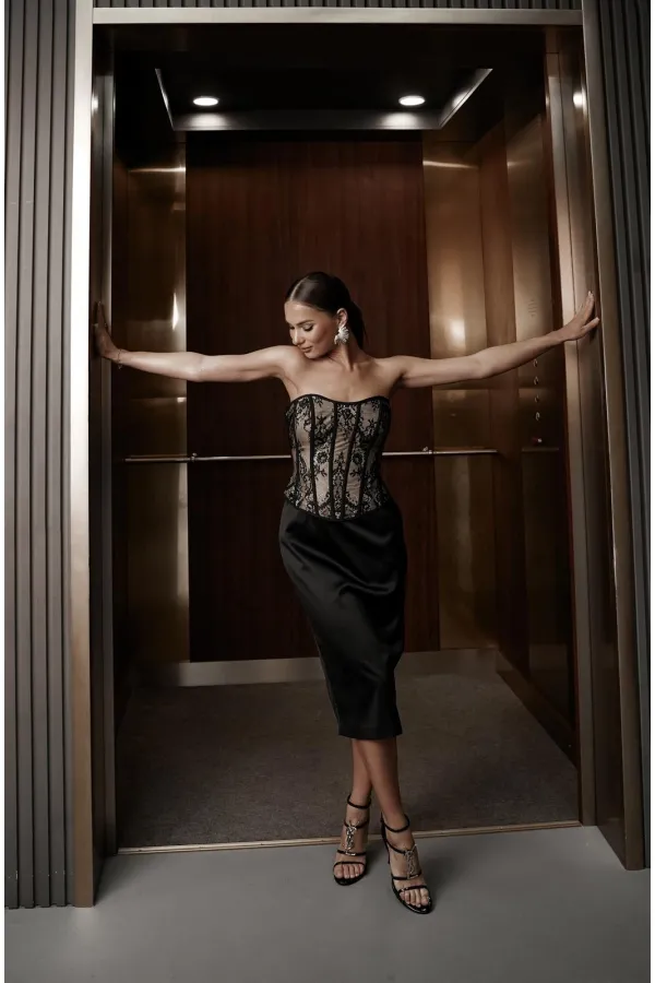 Укороченная блузка из кружева с сатиновой подкладкой, прилегающего силуэта. По спинке шнуровка. По переду и спинке по три рельефных шва. Блузка отлично подойдет для коктейльных и вечерних выходов, ее можно использовать, как самостоятельный предмет одежды или надевать вторым слоем поверх рубашек или платьев.