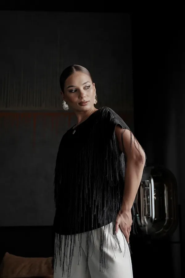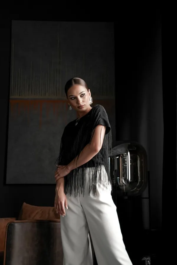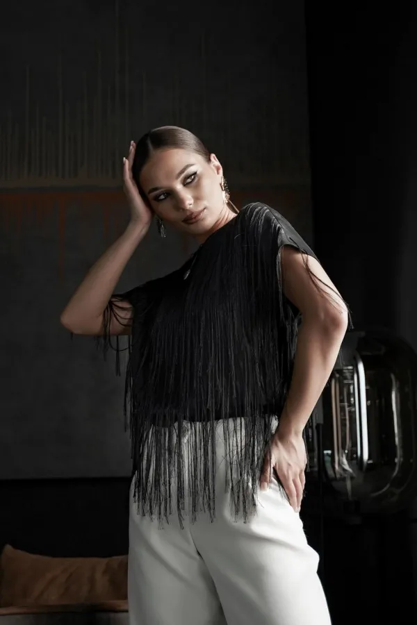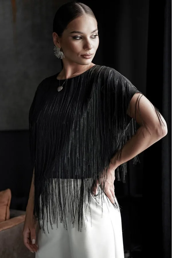 Блузка свободного силуэта с коротким цельновыкроенным рукавом, из нарядной плательно-блузочной ткани с бахромой. По переду горловина округлой формы, по спинке-V-образной. Блузка на атласной подкладке.