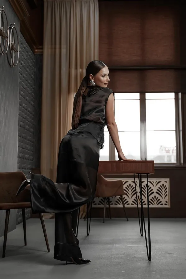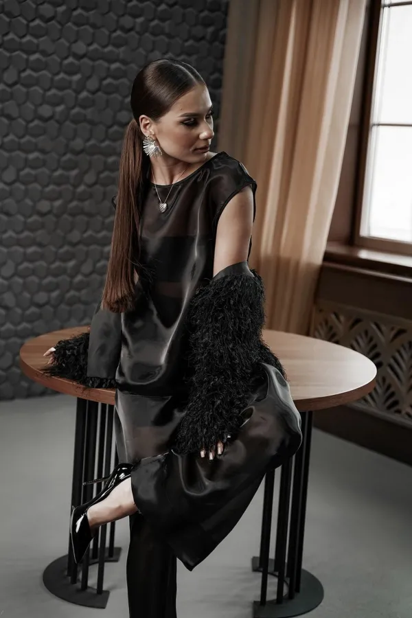Блузка прямого силуэта со спущенным плечом из полупрозрачной ткани «органза». Горловина округлой формы. Длина блузки 59 см. Рост 164-170 см.Измерения по готовому изделию 44 р-р: ОГ - 100 см., ОТ - 96 см., ОБ - 106 см. ... Читать далее...