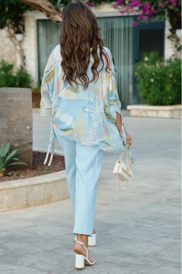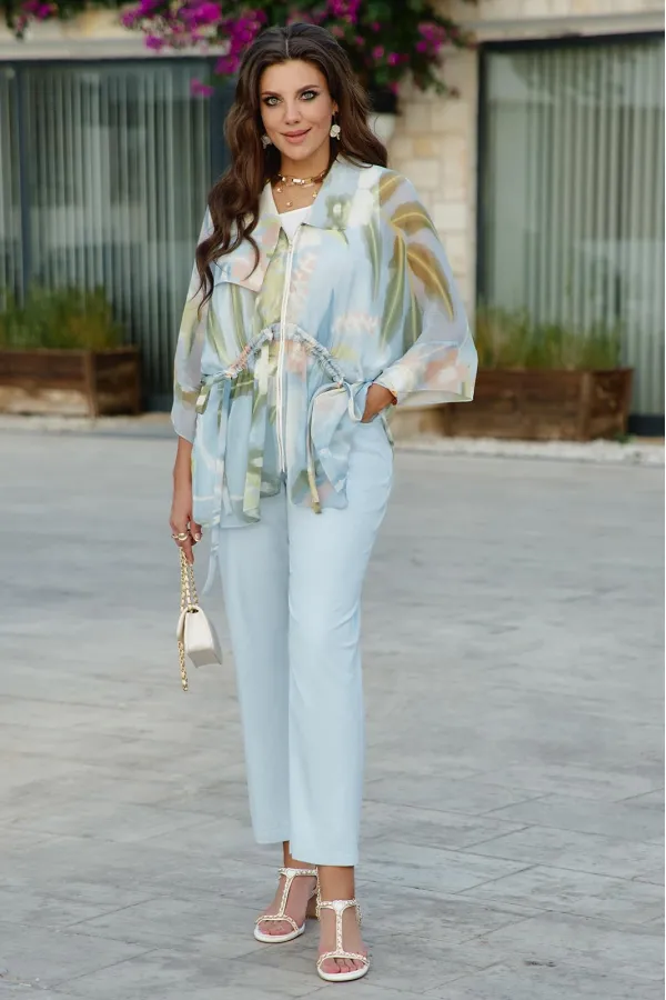 Комплект женский, двух предметный, состоящий из блузки и блузы. Этот комплект читает женственность спокойно — без пафоса. Он рассказывает о комфорте, о внимании к текстурам и о желании выглядеть легко, но продуманно. Вместе они создают образ, где современная минималистика встречается с женственной романтикой: практично, но вдохновляюще. Главный акцент комплекта – это невесомая шифоновая блузка с абстрактным цветочным принтом в пастельных тонах, создающая ощущение воздушности и легкости. Ее свободный крой и завязки на талии позволяют регулировать силуэт, добавляя динамичности. Его дополняет базовая белая блуза, которая служит чистым холстом для более яркого элемента. Блузка свободного силуэта, с центральной застёжкой на тесьму молнию по переду; воротник в блузке отложной, ассиметричный. В качестве отделочного элемента по переду блузки - кулиса со шнуром из основной ткани. Рукав цельнокроеный, длиной 7/8, с притачной манжетой. По спинке отрезная кокетка. Низ в блузке ассиметричный. Блуза прямого силуэта с округлой формой горловины и нагрудными вытачками по полочке. Спинка без особенностей. Данный комплект имеет множество вариантов стилизации. Можно неебрежно заправить переднюю часть блузы в джинсы — блузка свободно расправится сверху. Застегнуть молнию наполовину, чтобы создать V-образный переход между шифоном и топом. Длина верхней блузы по центру спинки 75,5 см (р 52-56), 76 см (р 58-62). Длина рукава верхней блузы 56 см (р 52-56), 57 см (р 58-62).Подробные замеры смотрите на дополнительном фото. Подходит на рост 164-170.