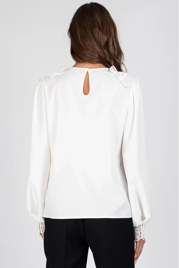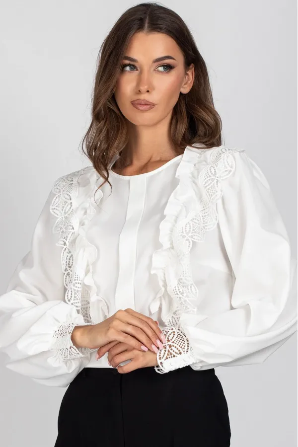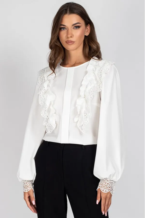 Блузка женская полуприлегающего силуэта. Перед блузы цельный, с нагрудными вытачками и отделочной планкой, с настроченными рюшами с кружевом. Спинка цельная с капелькой и застежкой на навесную петлю и пуговицу. Рукав втачной, присборенный в верхней части оката и внизу.