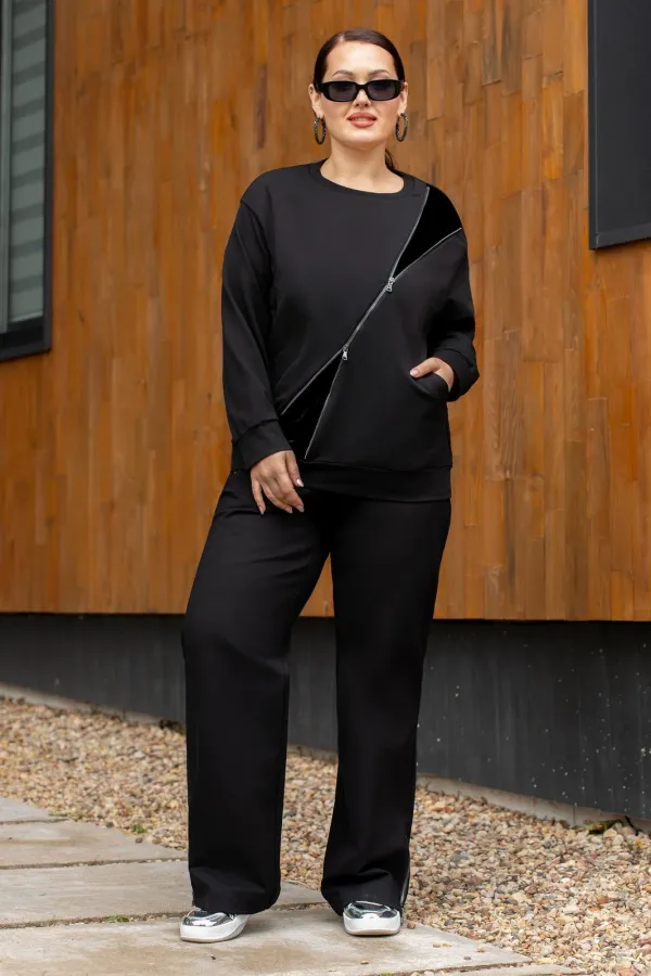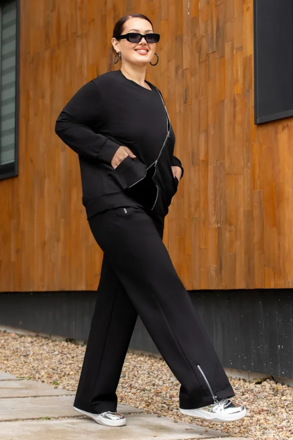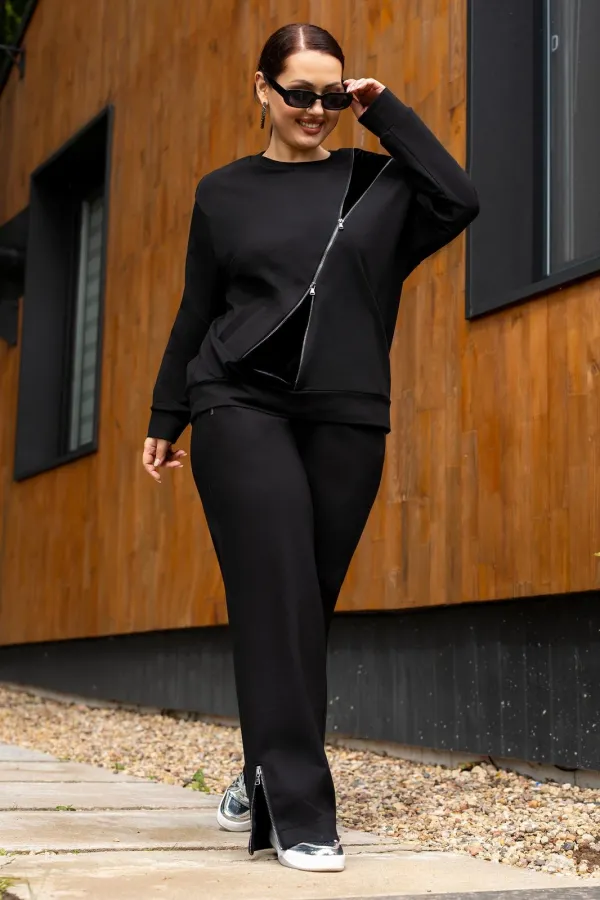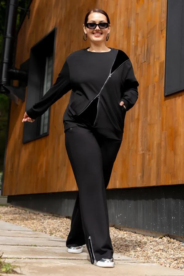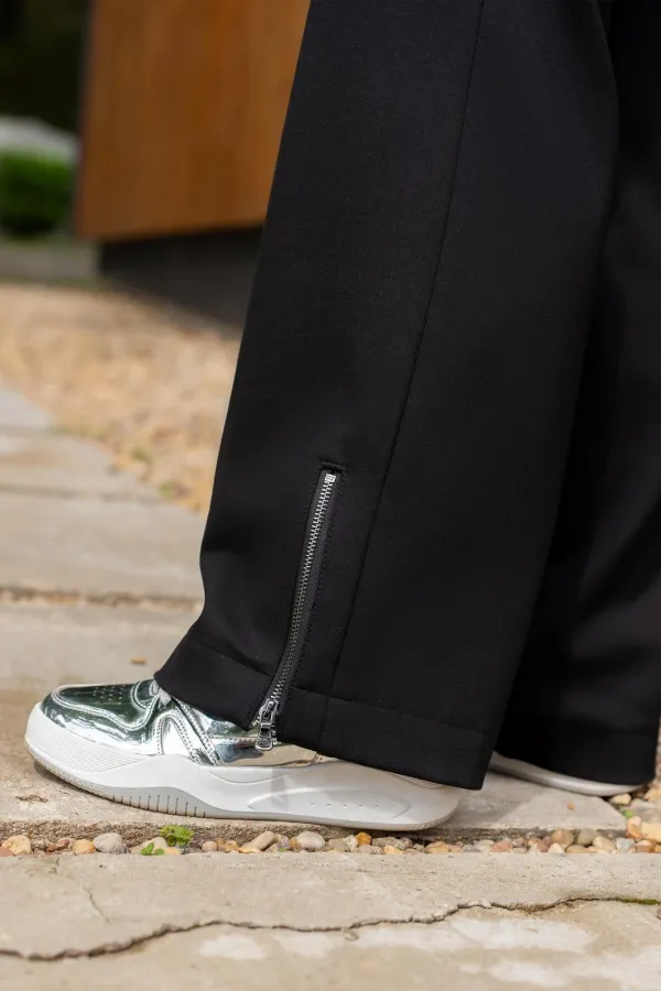Элегантные женские брюки прямого силуэта из мягкого трикотажа черного цвета обеспечивают комфорт и стиль на каждый день. Модель с эластичным поясом для идеальной посадки. Боковые карманы на удобных молниях добавляют функциональности, а декоративные молнии на нижней части брюк подчеркивают уникальность дизайна. Эти брюки будут отлично смотреться в любой обстановке, подчеркивая ваше чувство стиля.