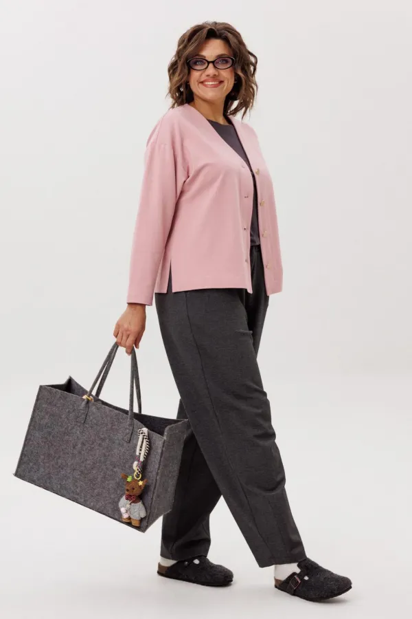 На модели в брюках цвета дымчатый тузсобран лук с пушистым жакетом 1661, розовым жакетом 1661.1 и жакетом 1778.Замеры: