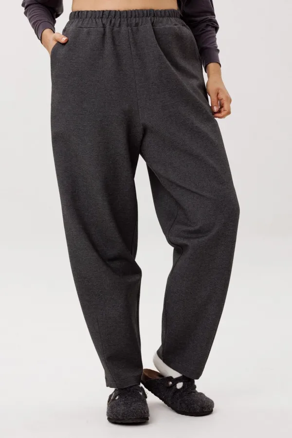 Идея повседневной элегантности обретает здесь свою совершенную форму — мягкий трикотаж, струящийся свободным кроем, нежно обволакивает фигуру, даря ей полную раскрепощенность. Высокая посадка становится основой безупречного силуэта, плавно ведущего взгляд от тонко подчеркнутой талии к изящному заужению книзу, созданному изящной вытачкой для идеальной посадки по ноге. Притачной пояс завершает эту гармонию линий, обеспечивая комфорт, который не приходится проверять, а боковые карманы добавляют практичной лаконичности.