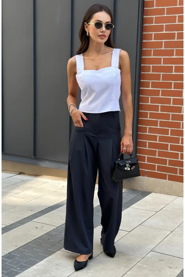 Брюки свободного кроя, по передним и задним половинкам обработаны прорезные карманы, вертикальные защипы по переду переходящие в складки зрительно вытягивают силуэт