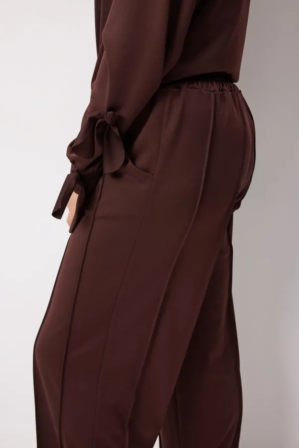 Брюки свободного кроя с притачным поясом на резинке с островком. Спереди и сзади расположены две застроченные стрелки. Это конструктивное решение позволяет сделать посадку идеальной и визуально удлинить ножки. По бокам брюк - карманы хулиганы. Низ обработан подгибкой.