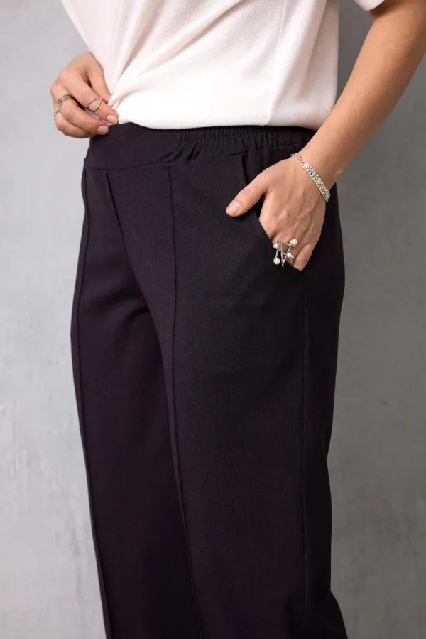 Если Вы хотите приобрести шикарные, базовые брюки, которые позволят создавать множество сочетаний, предлагаем Вашему вниманию модель, выполненную из приятного к телу слегка растяжимого текстиля, который подарит невероятный комфорт в носке. Благородный оттенок «чёрный баклажан» смотрится изысканно и дорого. Брюки прямого кроя с застроченными стрелками сделают Ваши ножки бесконечно длинными! Модель изумительно стройнит и вытягивает силуэт благодаря выверенным лекалам и отличной посадке. Пояс модели выполнен на резинке с островком. По бокам брюк - карманы хулиганы.
