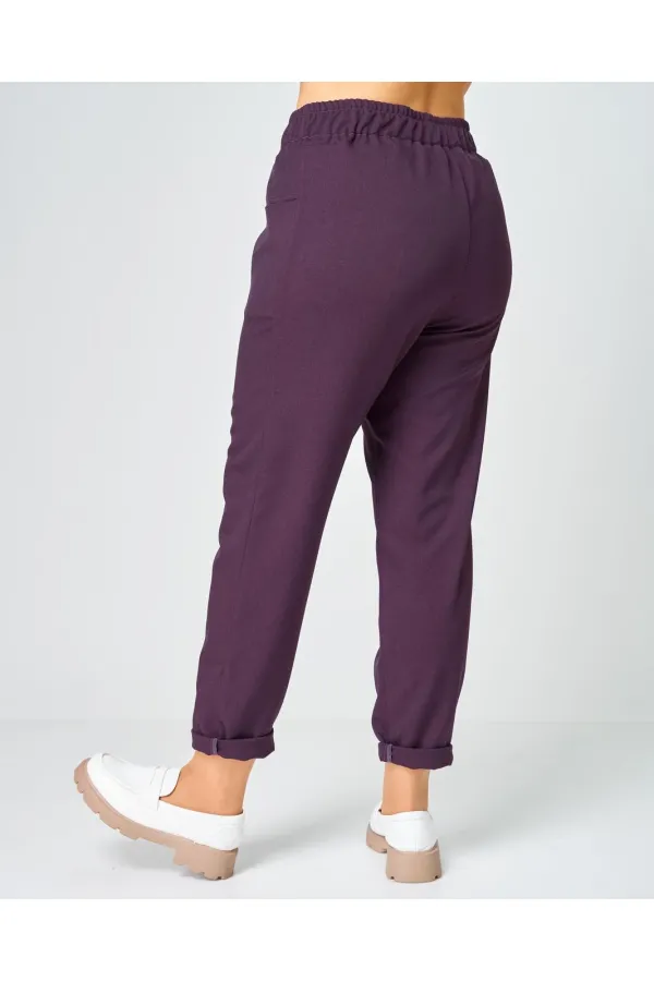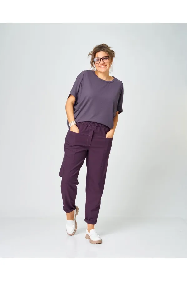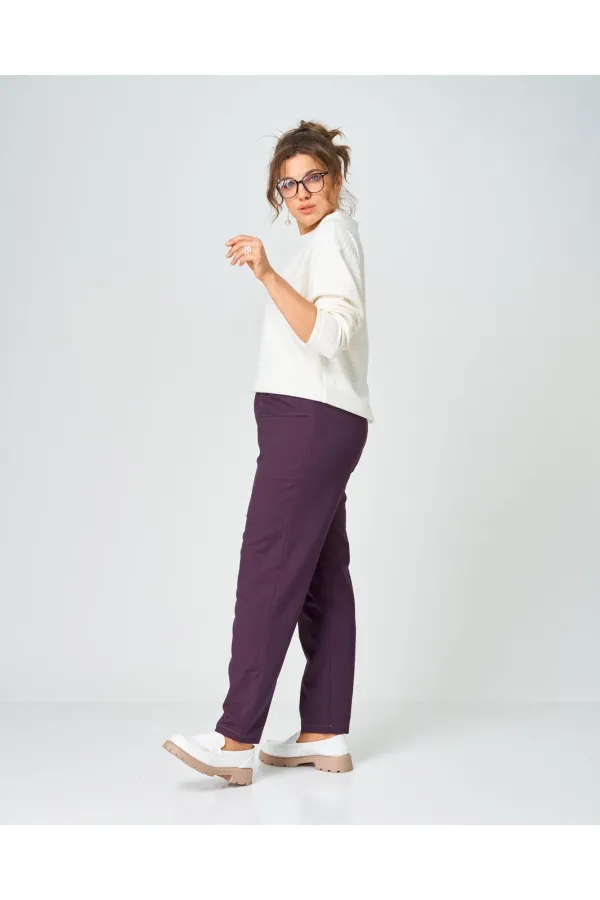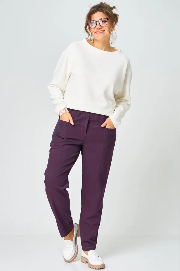 Эти стильные женские брюки выполнены в глубоким благородном оттенке тёмной сливы — цвете, который придаёт образу элегантность и легко сочетается как с базовыми, так и с яркими вещами гардероба.