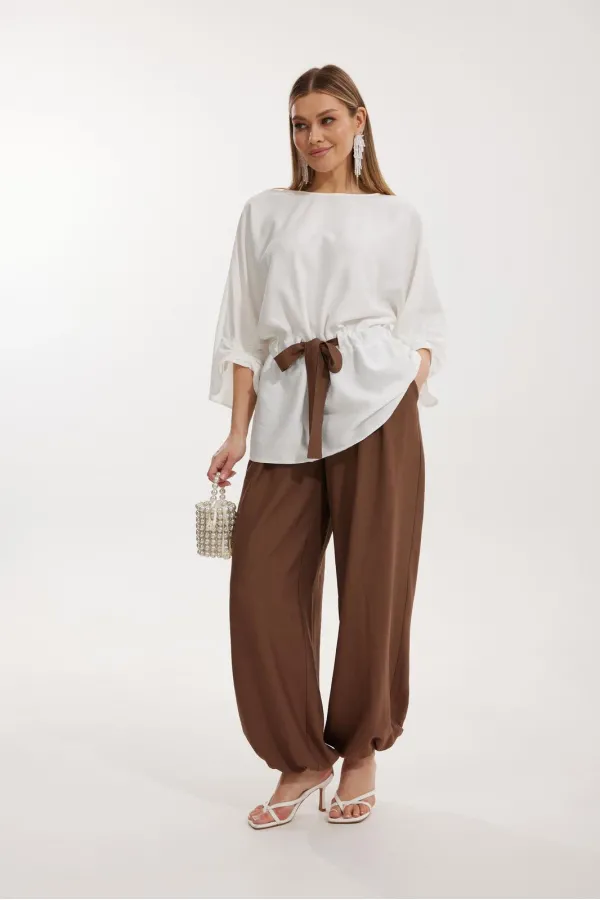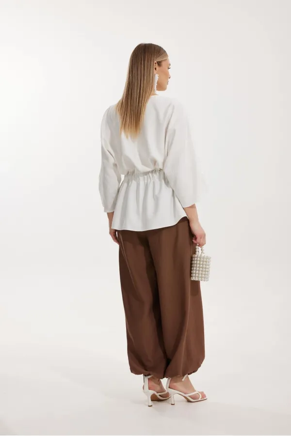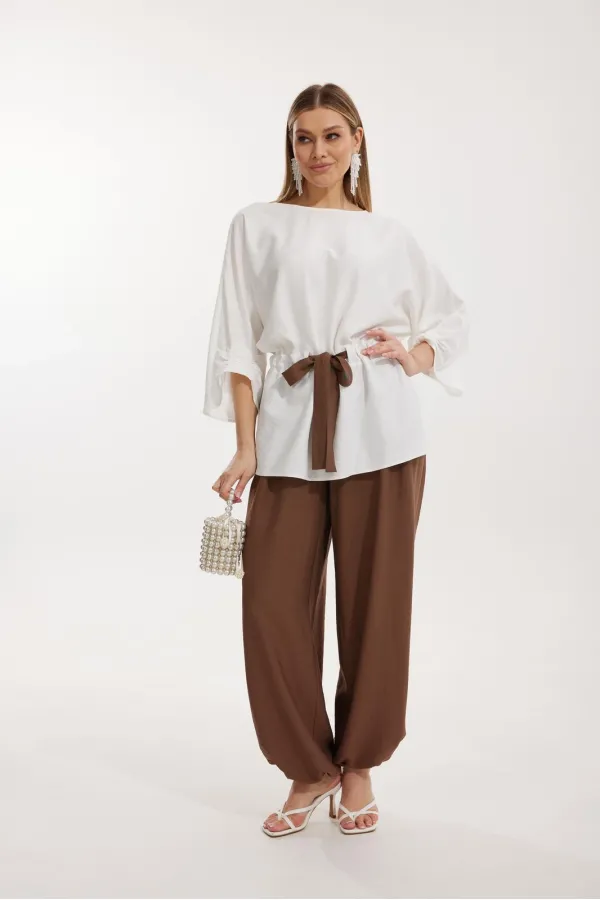 Брюки прямого силуэта с карманами в боковом шве и имитацией гульфика. Пояс притачной на резинке со шнуром в цвет отделочного канта. На задних половинках брюк застрочены вытачки. По низу брюки собраны на резинку.