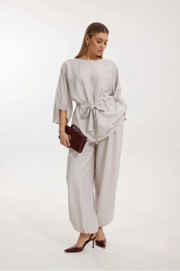 Брюки прямого силуэта с карманами в боковом шве и имитацией гульфика. Пояс притачной на резинке со шнуром в цвет отделочного канта. На задних половинках брюк застрочены вытачки. По низу брюки собраны на резинку.