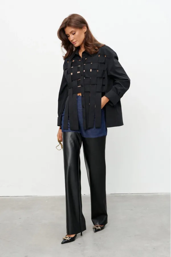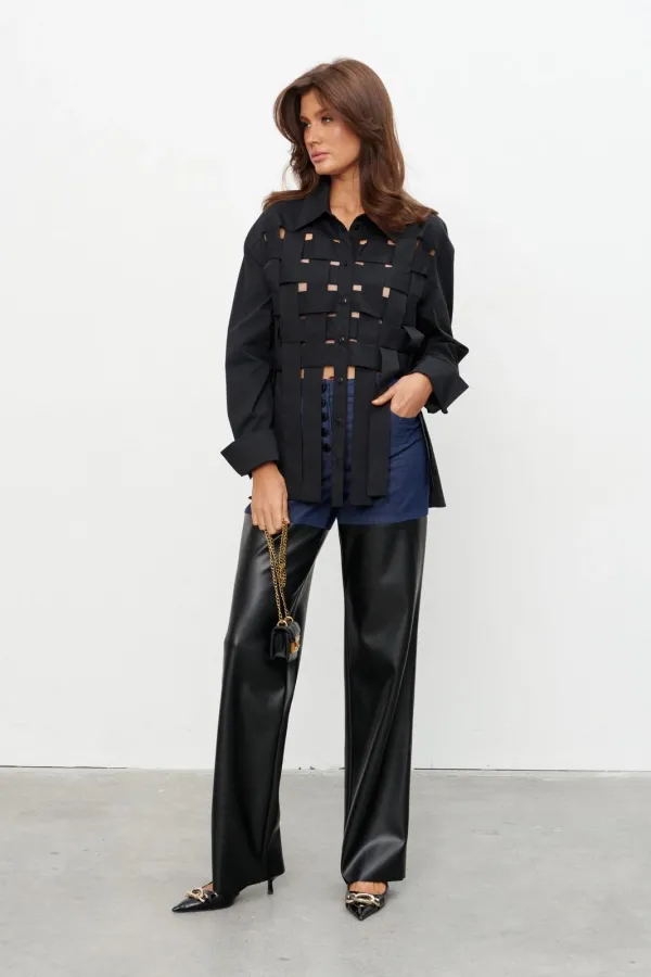 Брюки прямого силуэта выполнены на сочетании плотного джинса и экокожи. Брюки на поясе со шлёвками и застежкой на металлические пуговицы-болты. По переду два прорезных кармана, по спинке - два накладных.