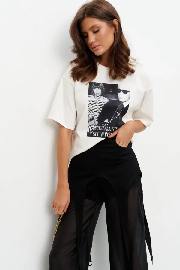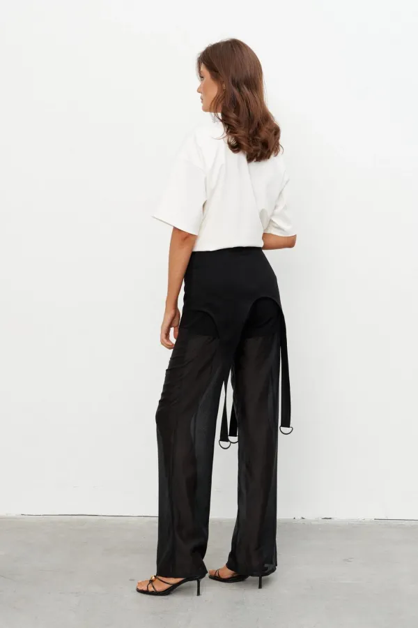 Брюки прямого силуэта с баской выполнены на сочетании плотного джинса и полупрозрачной вискозной вуали. Брюки на поясе со шлёвками и застёжкой на пуговицу-болт и молнию. Чуть ниже шва сидения идут подрезы имитирующие по форме мини-шорты. От подрезов вниз брюки выполнены из вуали. По переду два прорезных кармана, по спинке - два накладных.