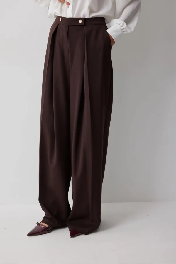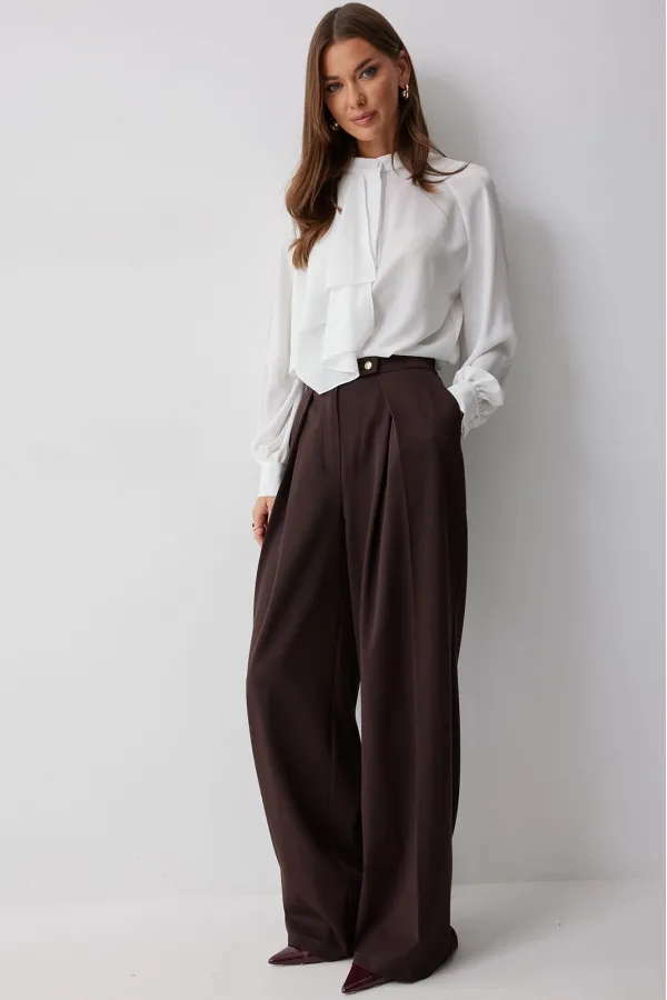 Брюки прямого силуэта расширенные книзу из костюмной ткани. По верху брюк притачной пояс с застежкой на петли и пуговицы. На передних половинках обработана застежка молния в среднем шве. На передних половинках карманы и декоративные складки. По поясу задних половинок брюк резинка и вытачки. Обращаем ваше внимание, что фурнитура может отличаться от фото.