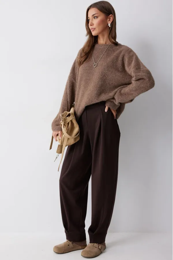 Брюки из костюмной ткани, зауженные книзу. По верху брюк притачной пояс с застежкой на петлю и пуговицу и шлевками для ремня. По поясу задних половинок брюк резинка. На передних половинках обработаны боковые карманы и застежка молния в среднем шве. По верху и низу брюк расположены встречные складки. По низу брюк – манжеты. На задних половинках накладные карманы.