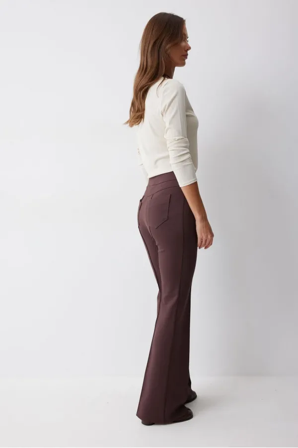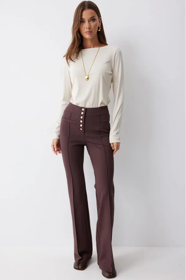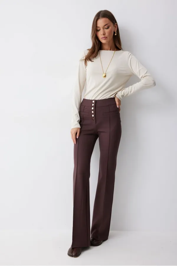 Брюки прямого силуэта с защипами из трикотажного полотна. По верху брюк притачной пояс и центральная застежка на петли и пуговицы. На передних половинках защипы и декоративные листочки. На задних половинках брюк накладные карманы. Обращаем ваше внимание, что фурнитура может отличаться от фото.