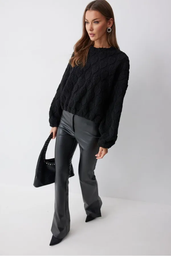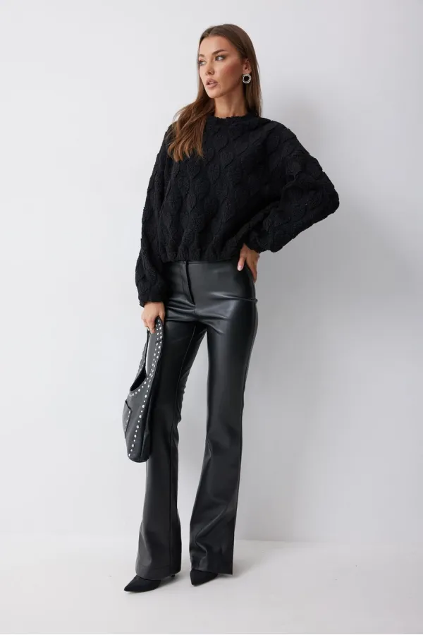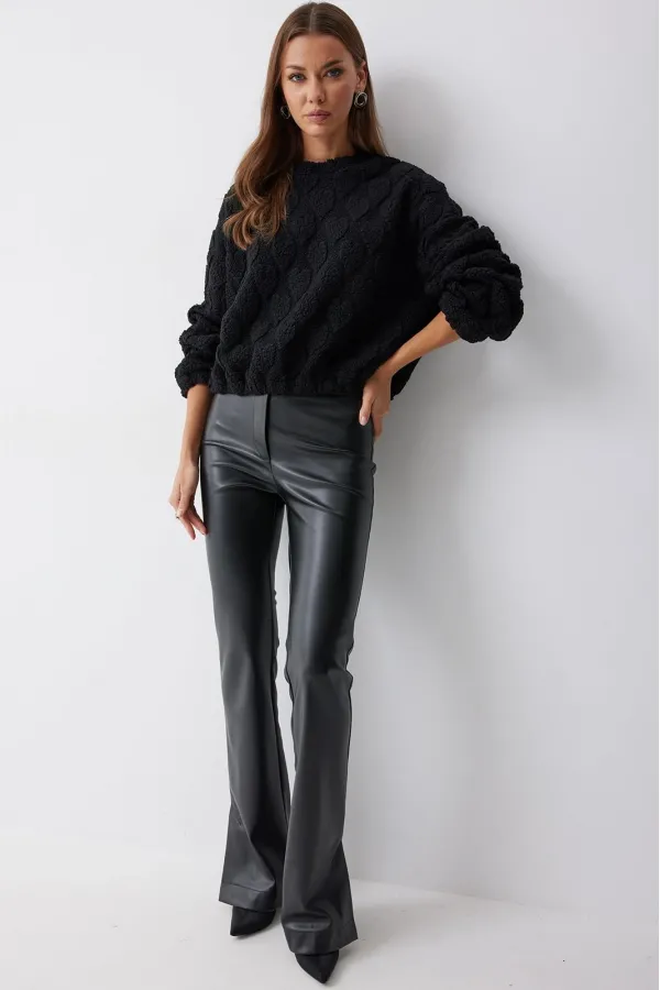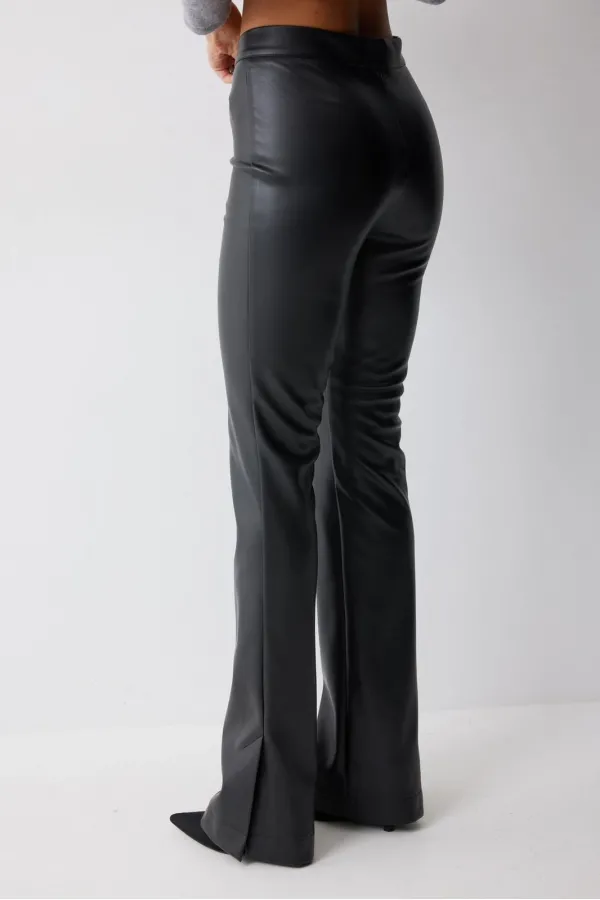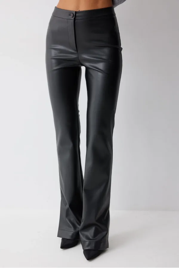 Брюки прилегающего силуэта расширенные книзу из экокожи. По верху притачной пояс с застежкой на петлю и пуговицу. На передних половинках обработана застежка молния в среднем шве. По низу брюк в боковом шве шлица.Обращаем ваше внимание, что фурнитура может отличаться от фото.