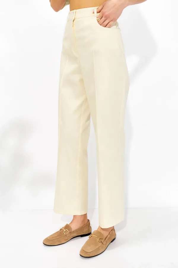 Брюки полуприлегающего силуэта из джинсовой ткани. По верху брюк притачной пояс со шлевками для ремня. На передних половинках обработаны карманы, декоративные защипы и застежка молния в среднем шве, на задних –кокетка и карманы. По поясу задних половинок брюк эластичная тесьма (резинка). Обращаем ваше внимание, что фурнитура может отличаться от фото.