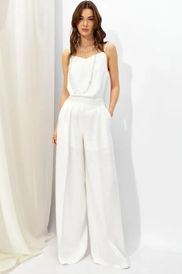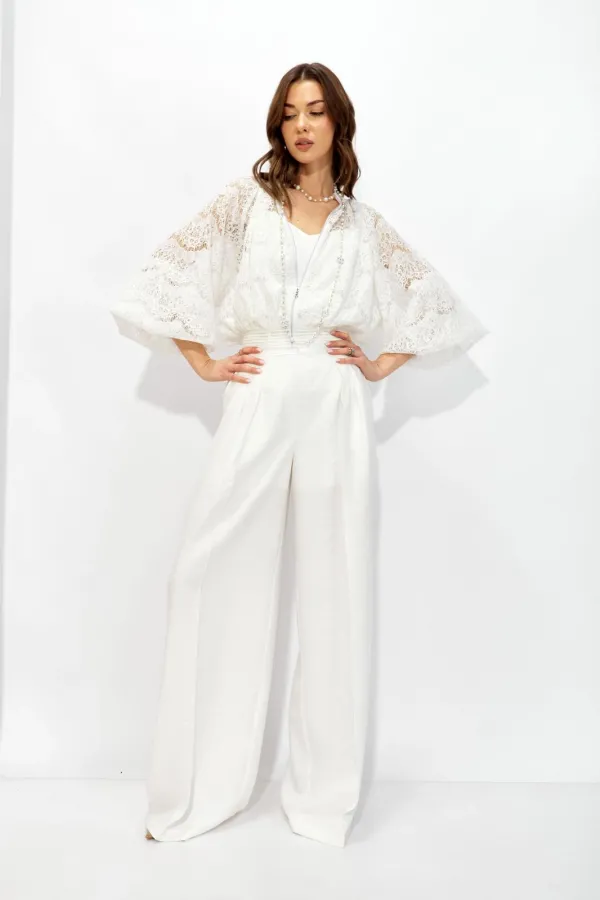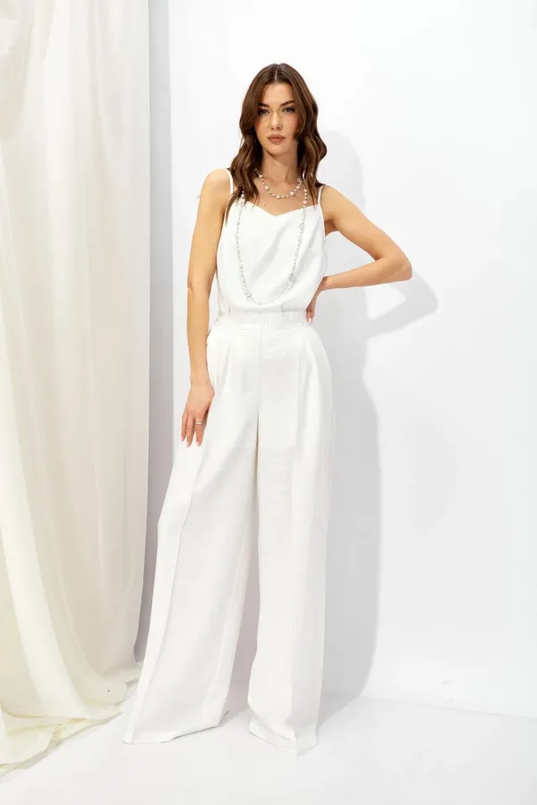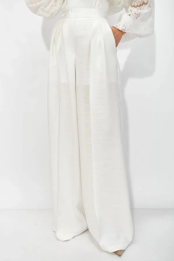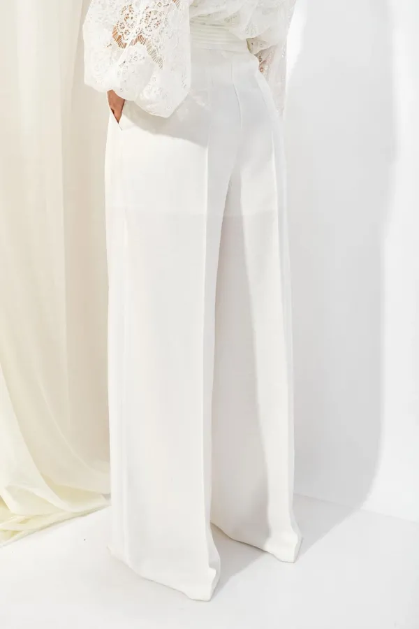 Брюки прямого силуэта из струящейся ткани. По верху брюк притачная декоративная резинка. По переду обработаны карманы в боковых швах и декоративные складки. На задних половинках брюк листочки. Брюки на подкладке! Обращаем ваше внимание, что фурнитура может отличаться от фото.