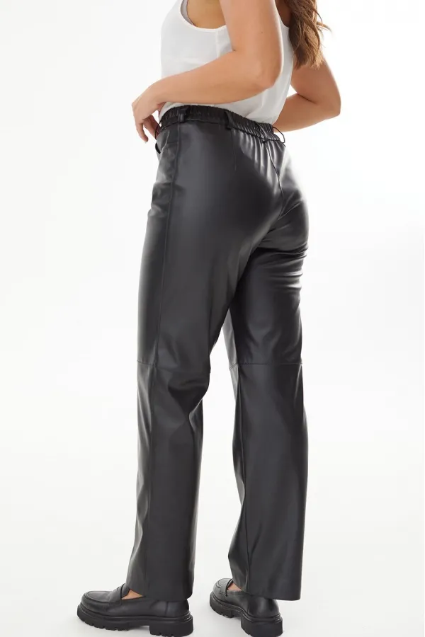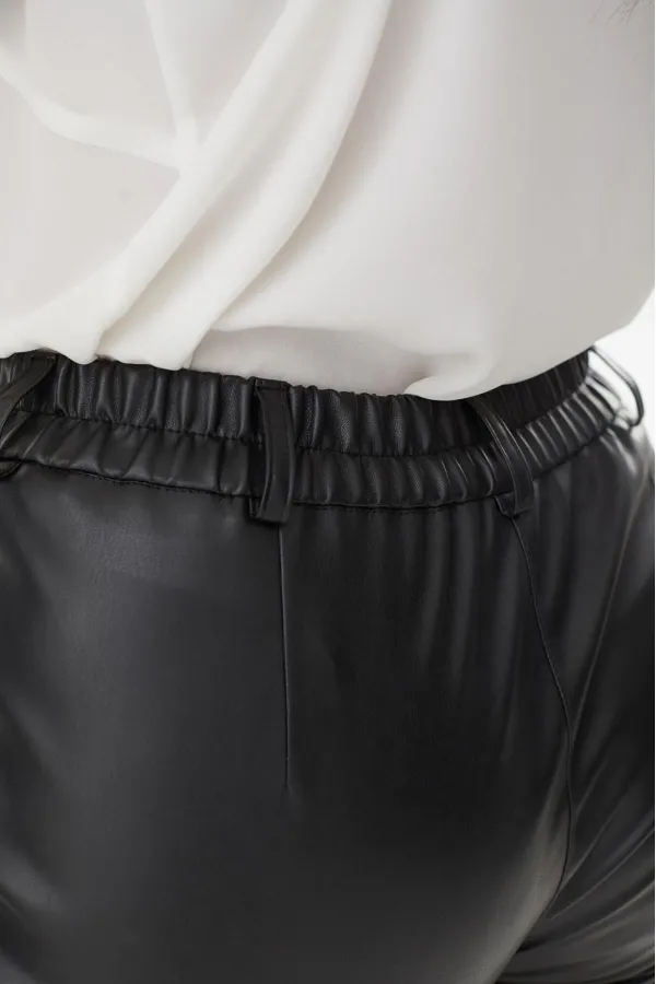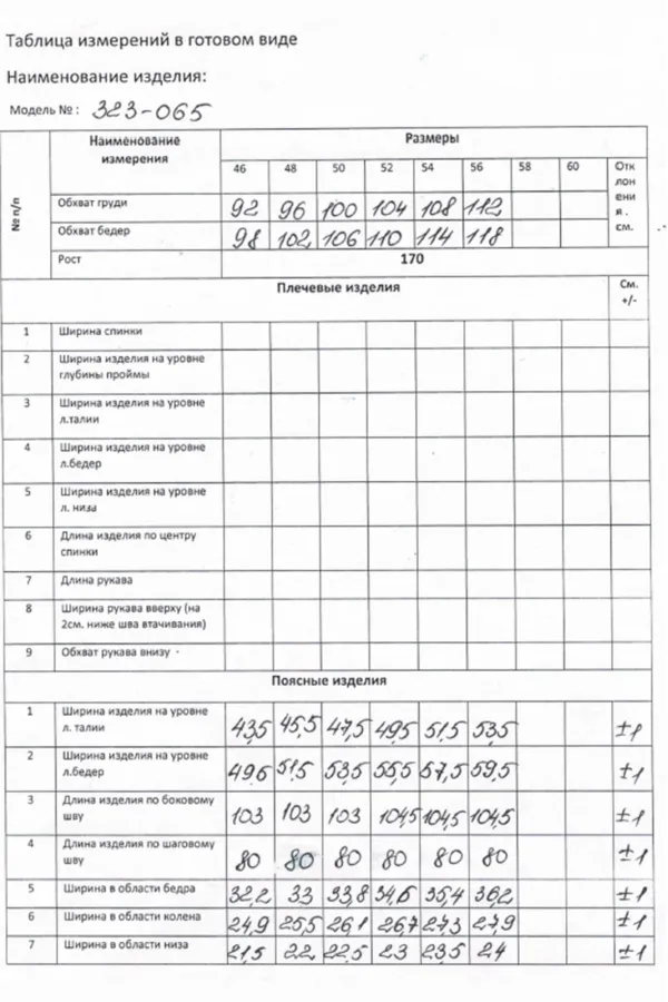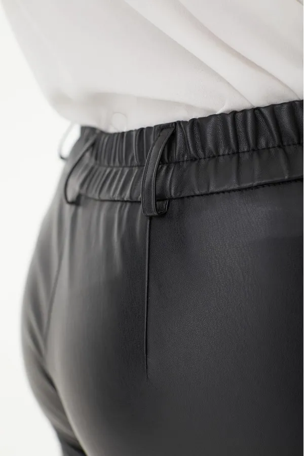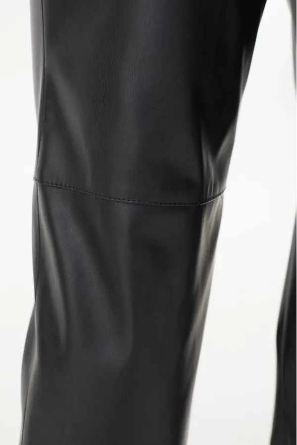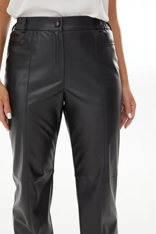 Брюки из плотной эко-кожи прямые от бедра. Спереди карманы с квадратным входом, чуть выше колена спереди и сзади горизонтальные рельефы, выделенные отделочной строчкой. По переду вертикальные рельефы с отделочной строчкой. Застежка - гульфик на кнопку и молнию. Пояс прямой, сзади на резинке, на поясе шлевки. Замеры в готовом виде смотрите в таблице на фото.