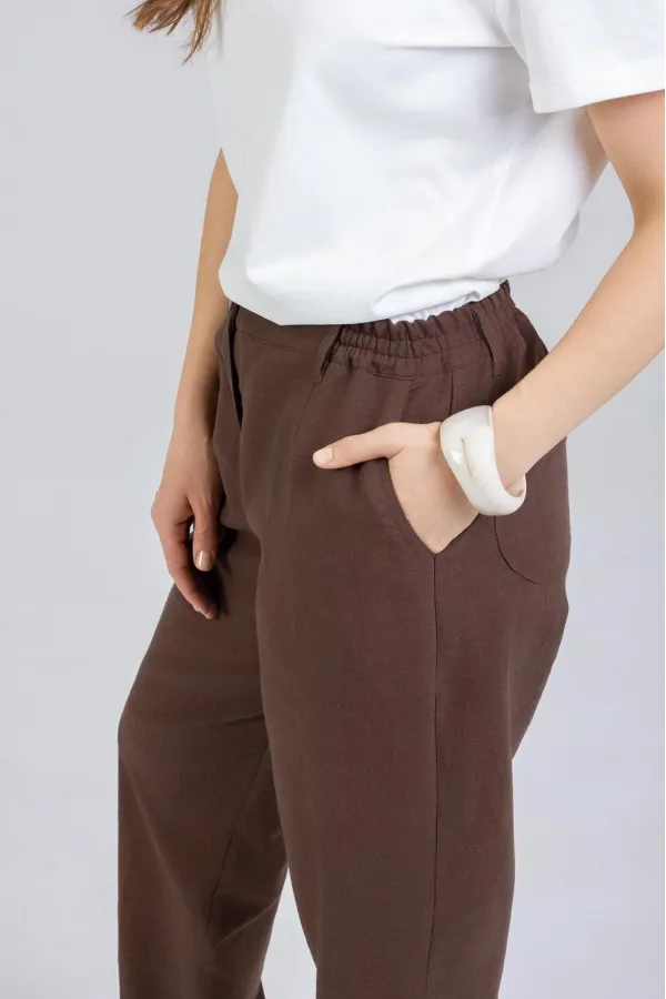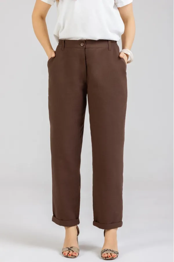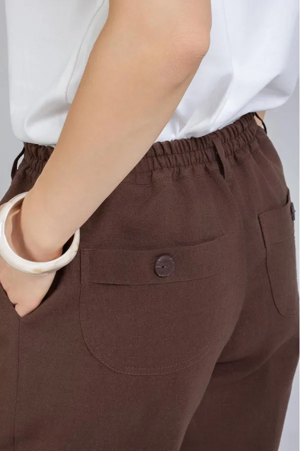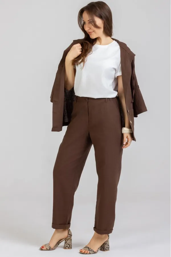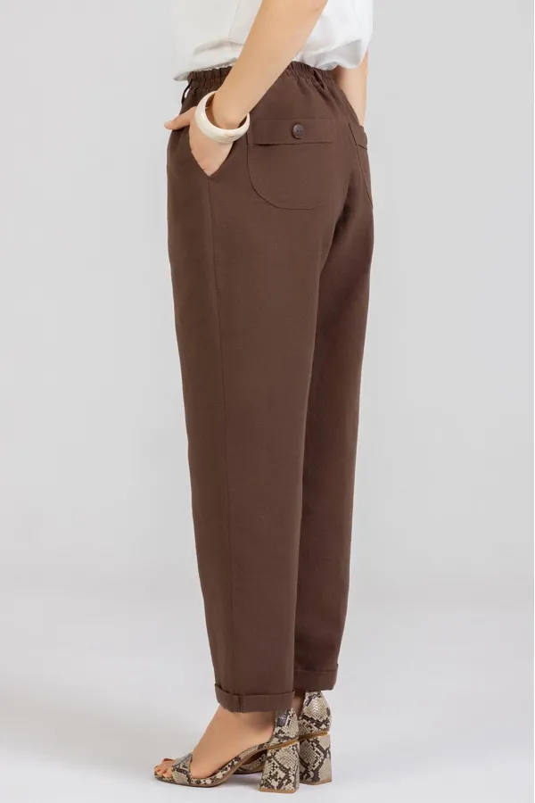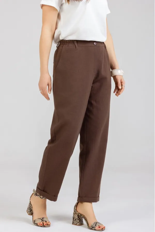 Стильные Брюки -Бананы изготовлены из качественного льна с эффектом мятости. Брюки летнего ассортимента, свободные ,застёгиваются на молнию. По переду внутренние карманы. Сзади накладные карманы. Очень удобные. Отворот не закреплён. Подходят как на рост 164, так и на рост 170. Застёгиваются на молнию и 2 пуговицы. В задней части пояса и частично по переду вставлена резинка. Посадка: средняяДлина брюк по боковому шву с поясом 100-103 см . Длина пояса ( резинка в растянутом виде): 46 р.-82 см, 48 р.-86 см, 50 р.-91 см, 52 р-95 см, 54 р-100 см