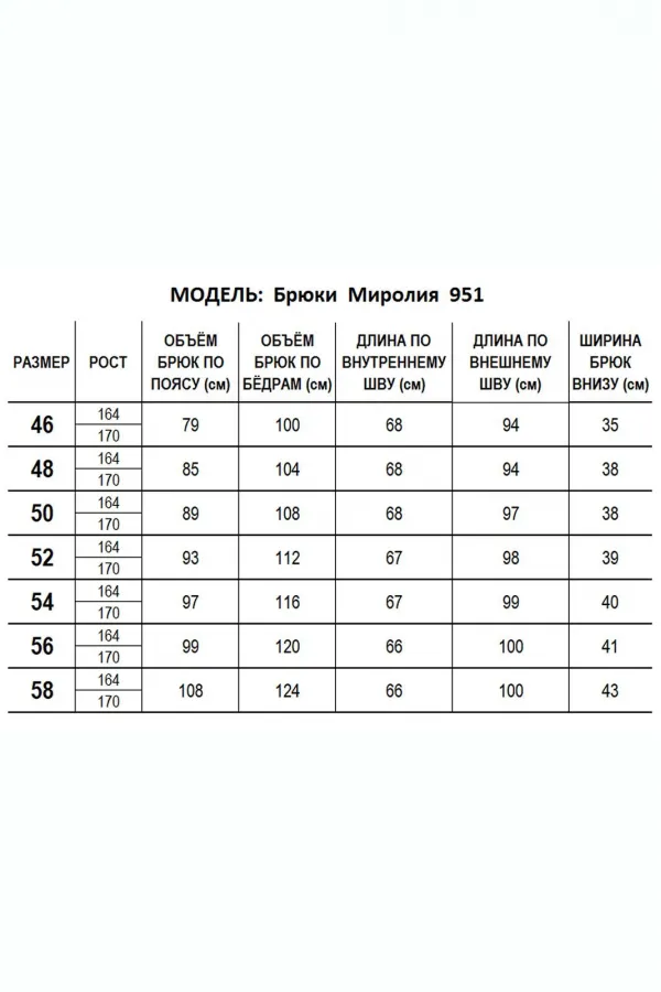 Очень удобные классические брюки 7/8 зимнего ассортимента от белорусского производителя. Ткань мягкая и очень приятная к телу.Брюки со стрелками, подходят для офиса, прогулок и отдыха. На передней половинке внутренний прорезной карман. Сзади - имитация листочки. Застёгиваются на молнию спереди.В задней части пояса вставлена резинка. Ширина пояса 3,5 см. Посадка:Р-ры 46-48 –средняя, Р-ры 50-58- высокая. Для выбора нужного размера воспользуйтесь размерной сеткой ( таблица).Рост: 164-170. Подробные замеры смотрите на дополнительном фото.