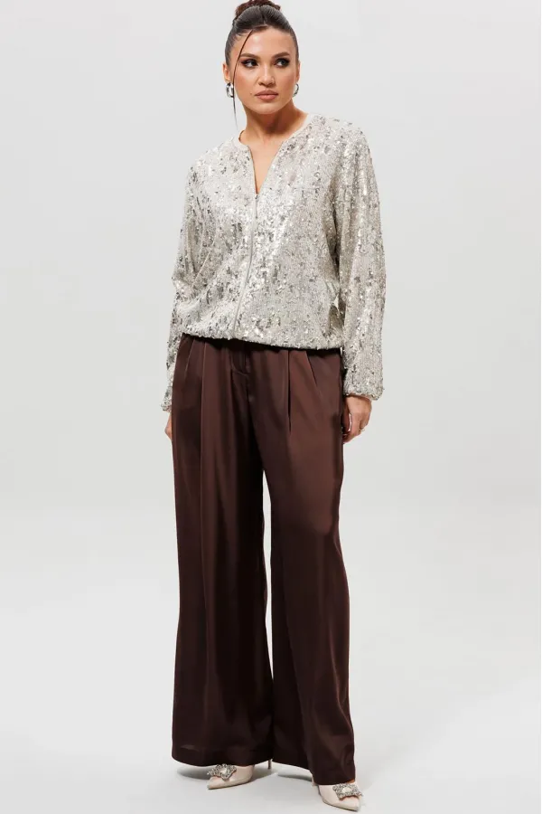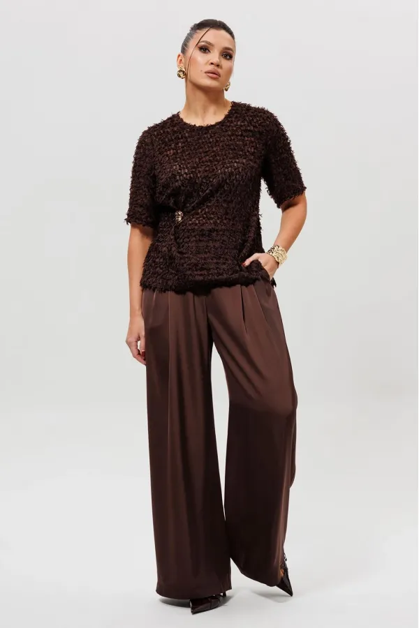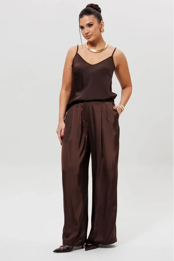 Брюки выполнены из атласной ткани, расширены к низу. На передних половинках брюк обработаны 2 складки и боковые карманы. На задних – талиевые вытачки. Застёжка на молнию и 2 потайных крючка. Эти атласные брюки (Арт. 1282) — Must Have для создания безупречного вечернего или праздничного образа. Модель представлена в двух богатых оттенках: насыщенном красном и глубоком шоколадном. Брюки выполнены из атласной ткани, которая мягко струится, подчеркивая изящество каждого движения. Универсальный крой позволяет сочетать их как с атласными топами (арт.1164) и блузами (например арт.1280) для выхода в свет, так и с кашемировыми джемперами для создания смарт-кэжуал образа. Атласные брюки с завышенной талией обеспечивают комфортную посадку и визуально вытягивают силуэт. Размеры 46-52.