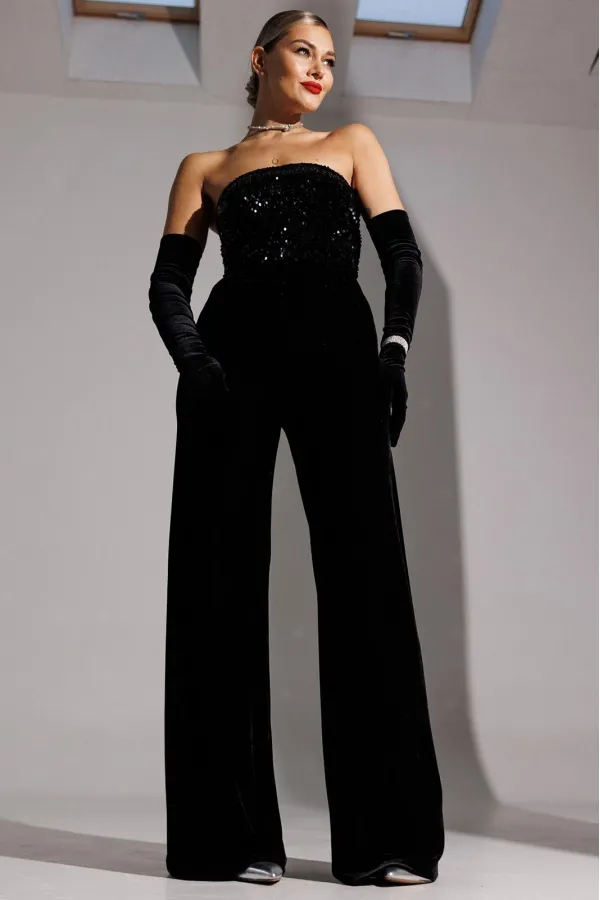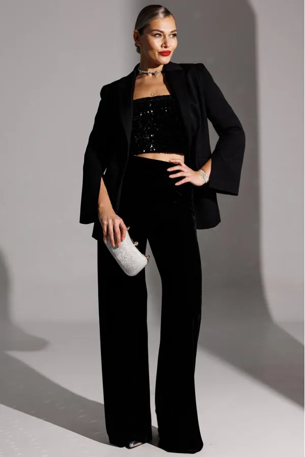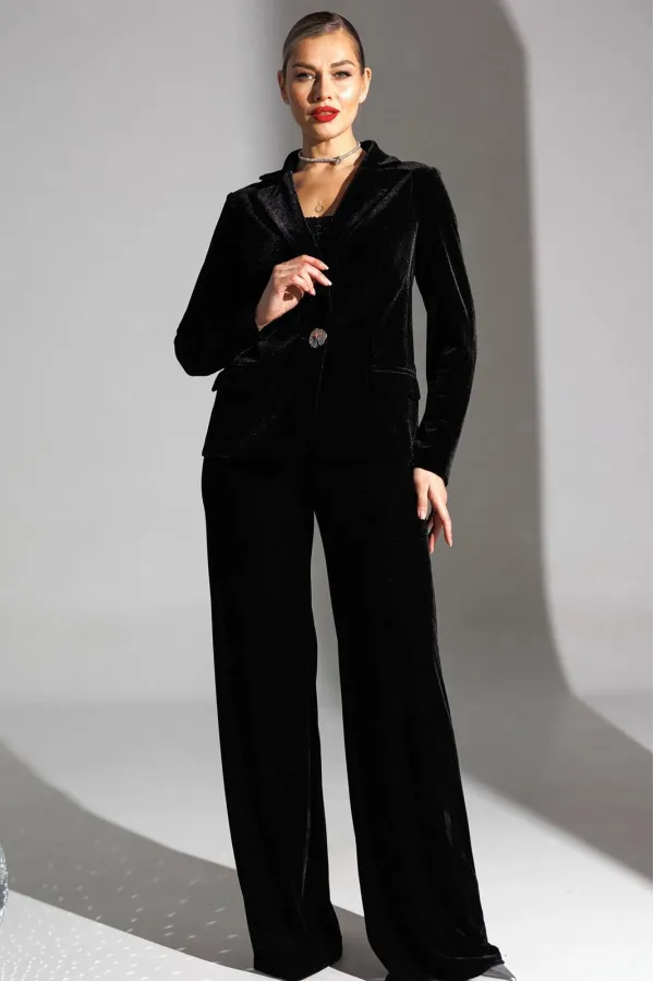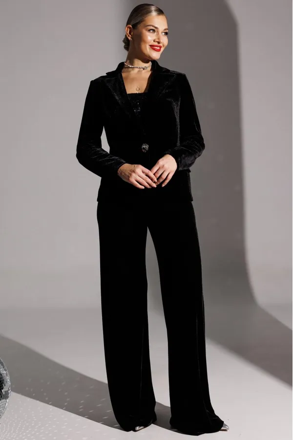 В предпраздничной суете так важно чувствовать себя комфортно, не жертвуя шиком. Наши велюровые брюки созданы именно для этого. Их струящийся силуэт и мягкий, глубокий черный цвет добавляют образу лоска, а тактильное наслаждение от ткани останется с Вами на весь вечер. Брюки с высокой посадкой, с притачным поясом на резинке, без боковых швов, слегка расширенные к низу. Наденьте наш бархатный жакет с велюровыми брюками - и Вы получите ансамбль тотальной гармонии. Дополните образ топом из пайеток - образ получается смелым. Легкая небрежность велюра и безупречная линия костюмного жакета создают тот самый сплав комфорта и стиля.