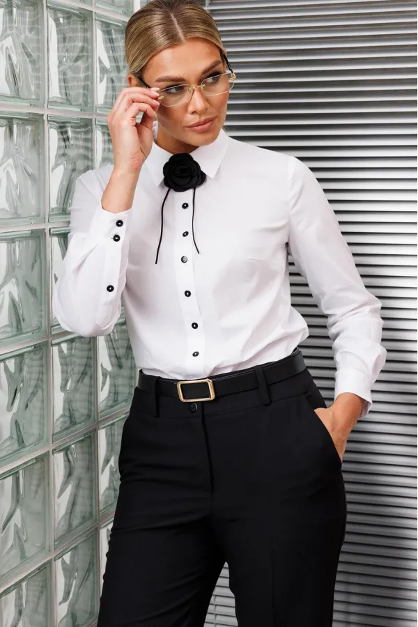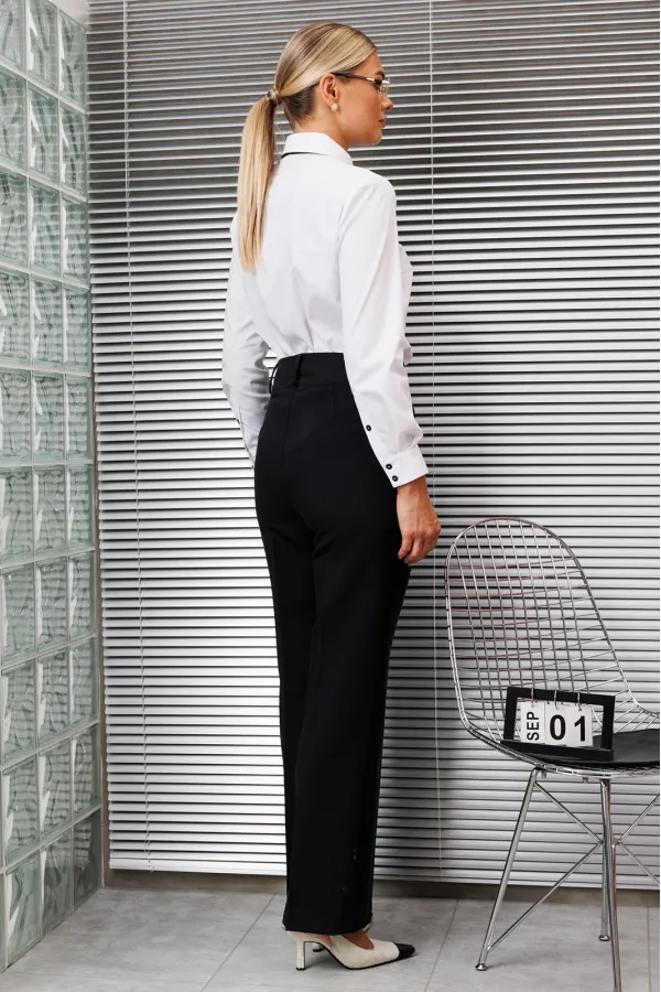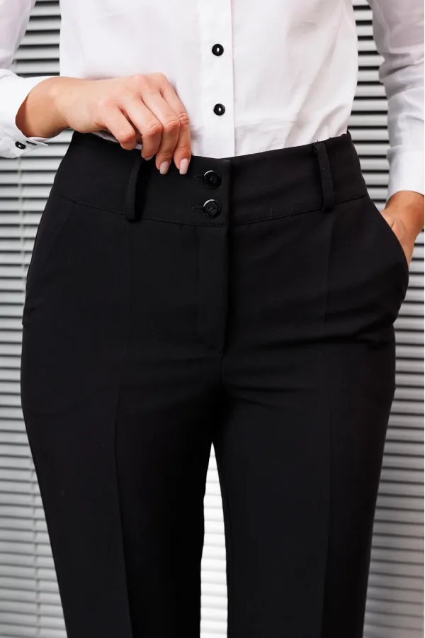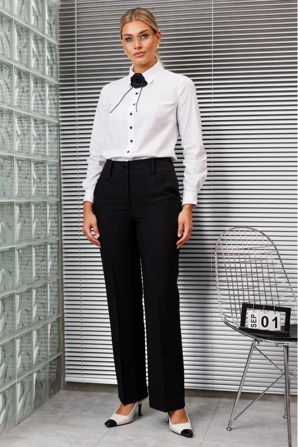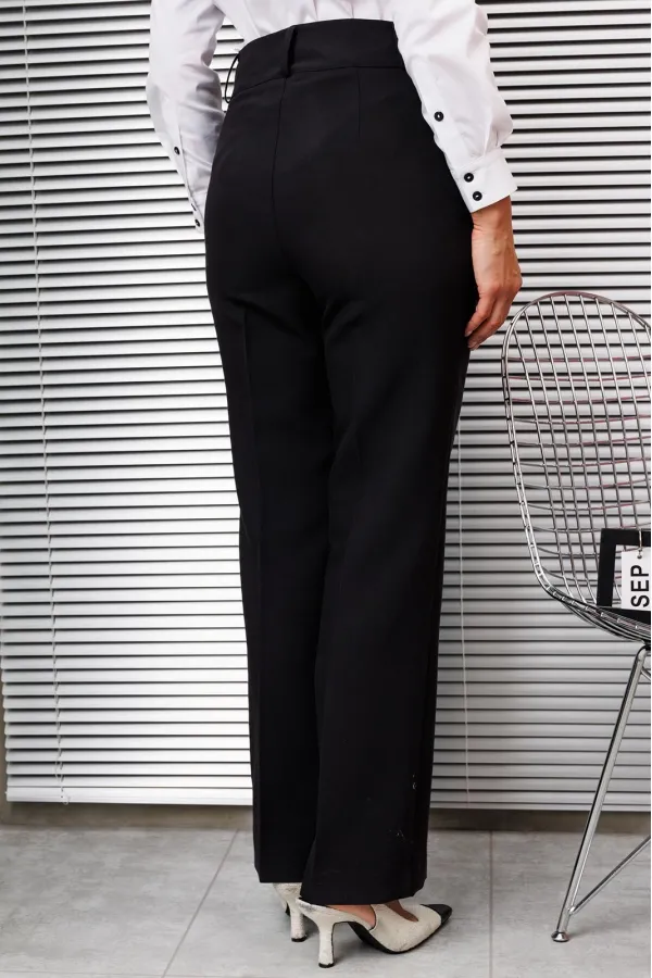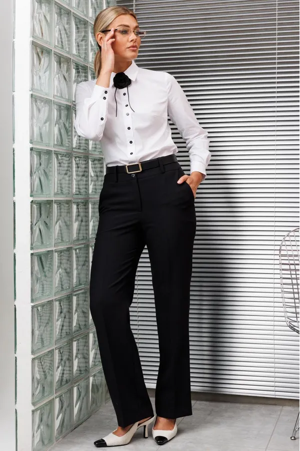 Брюки классические, прямого силуэта, с заутюженными стрелками, боковыми карманами, шлевками для ремня.