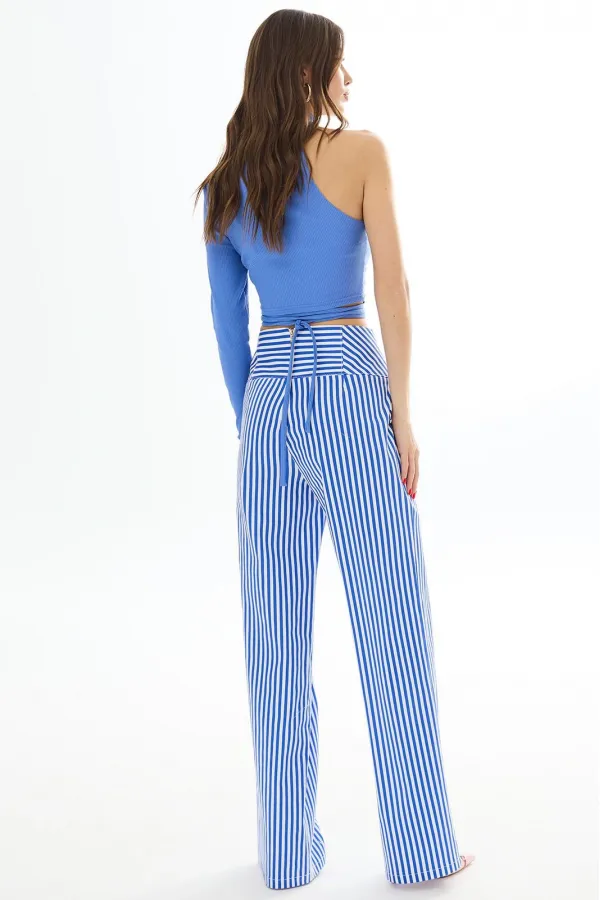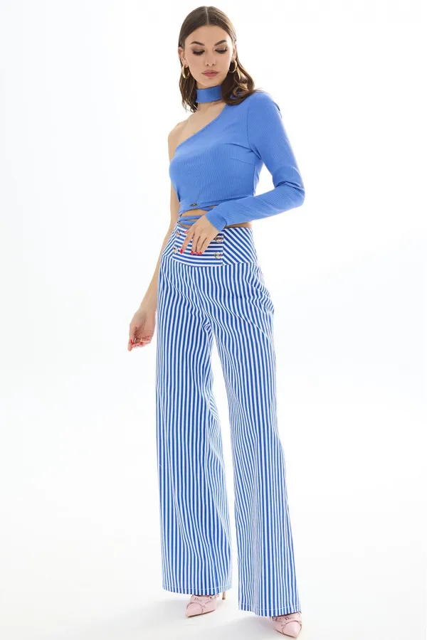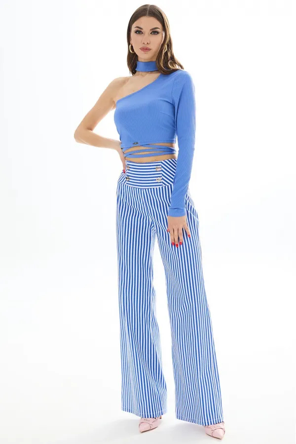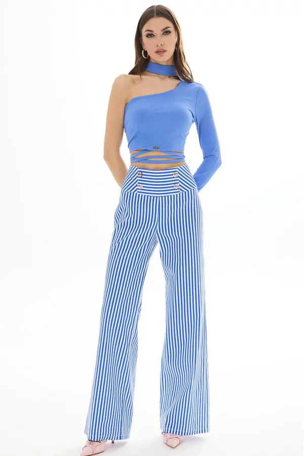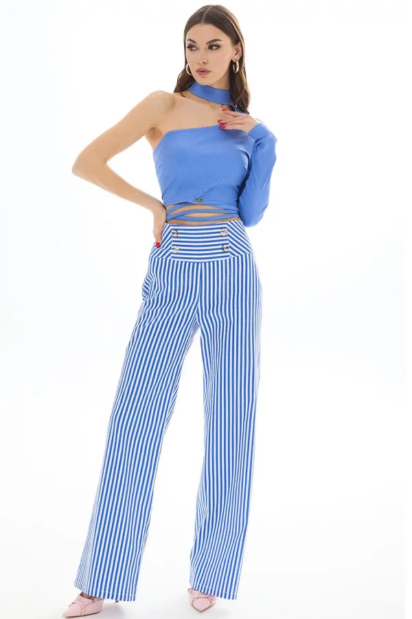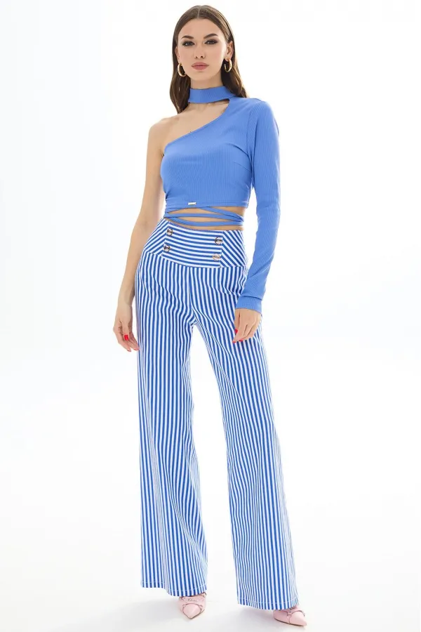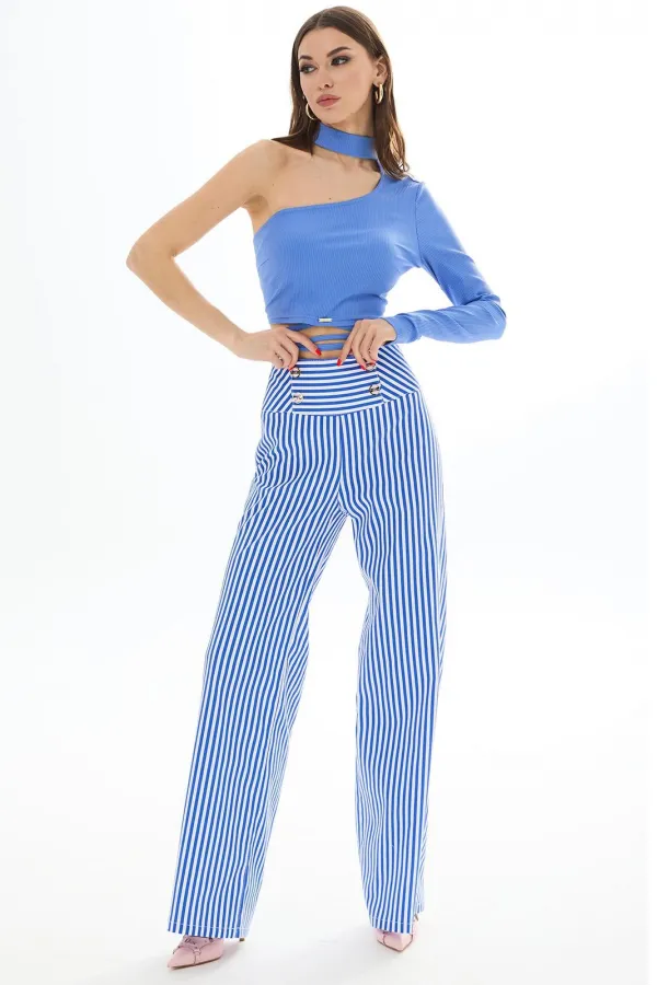 Брюки прямые из хлопковой ткани. Верх на высокой кокетке. Застежка сзади на декоративную молнию. На кокетке передних частей брюк декоративные пуговицы. Длина брюк Длина по боковому шву - 113 см.