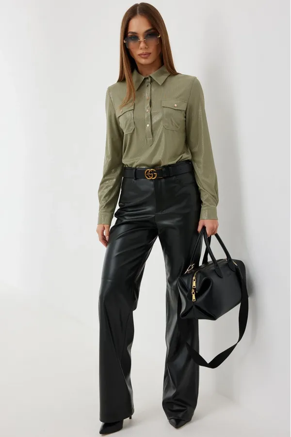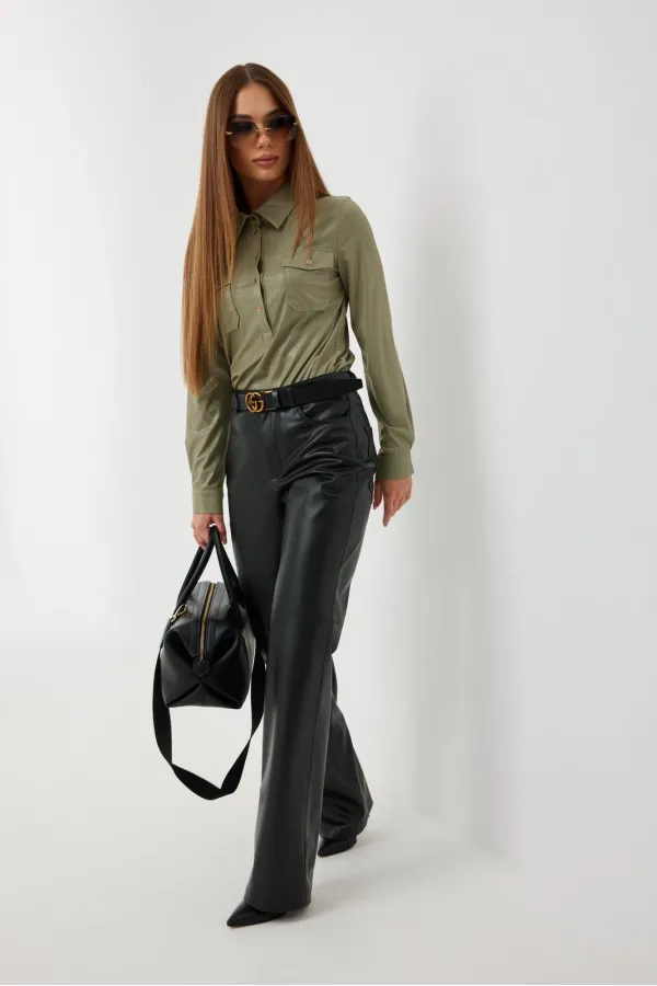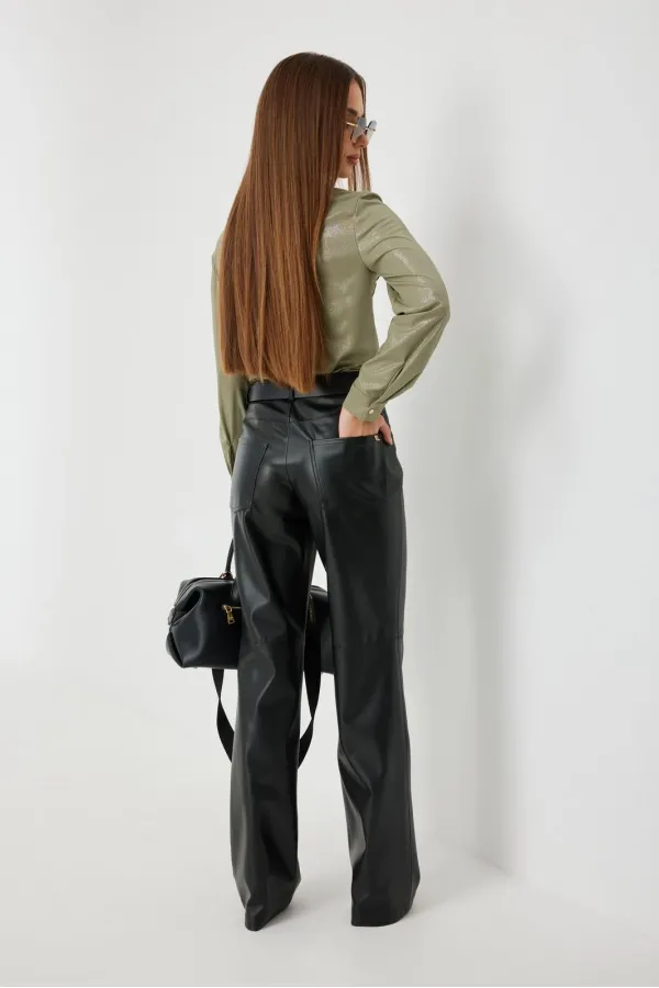Брюки прямого силуэта из «эко» кожи. Застёжка по переду на молнию и кнопку на поясе. Пояс притачной со шлёвками. По переду боковые карманы. Сзади накладные карманы. На брюках выполнен декоративный подрез.