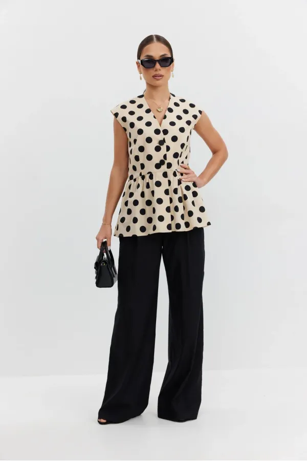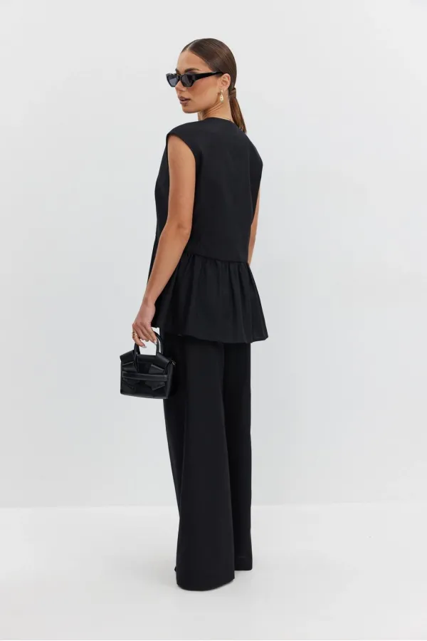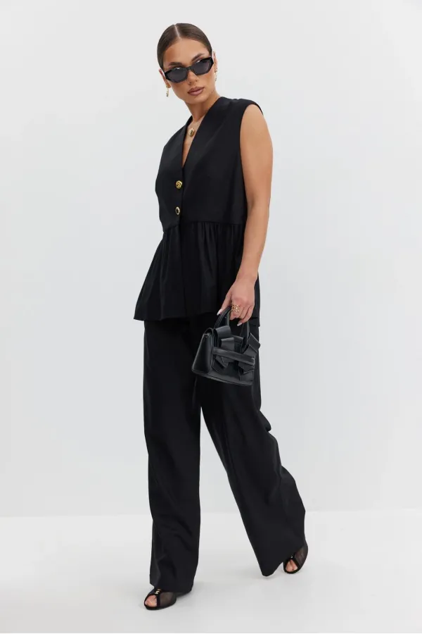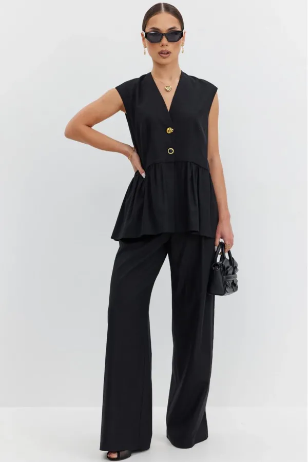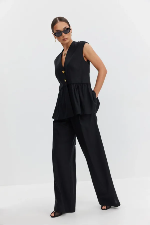 Брюки женские из льняной ткани, прямого кроя, высокая посадка, пояс притачной со шлевками под ремень, частично на резинке, застежка спереди на молнию и пуговицу. Передние половинки со складками и карманами в боковых швах. По задним половинкам талиевые вытачки.
