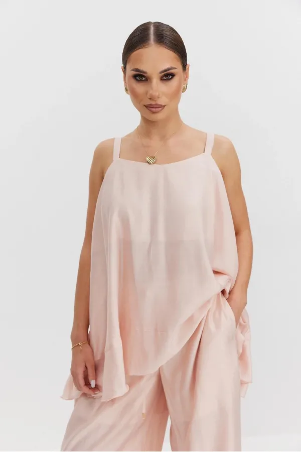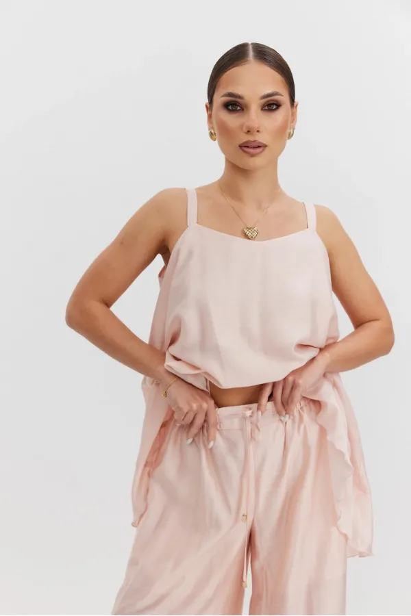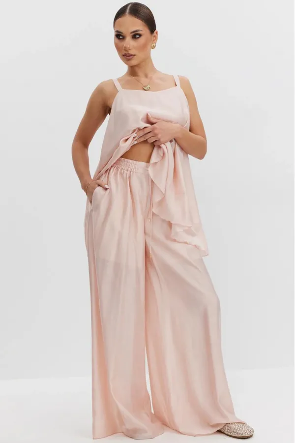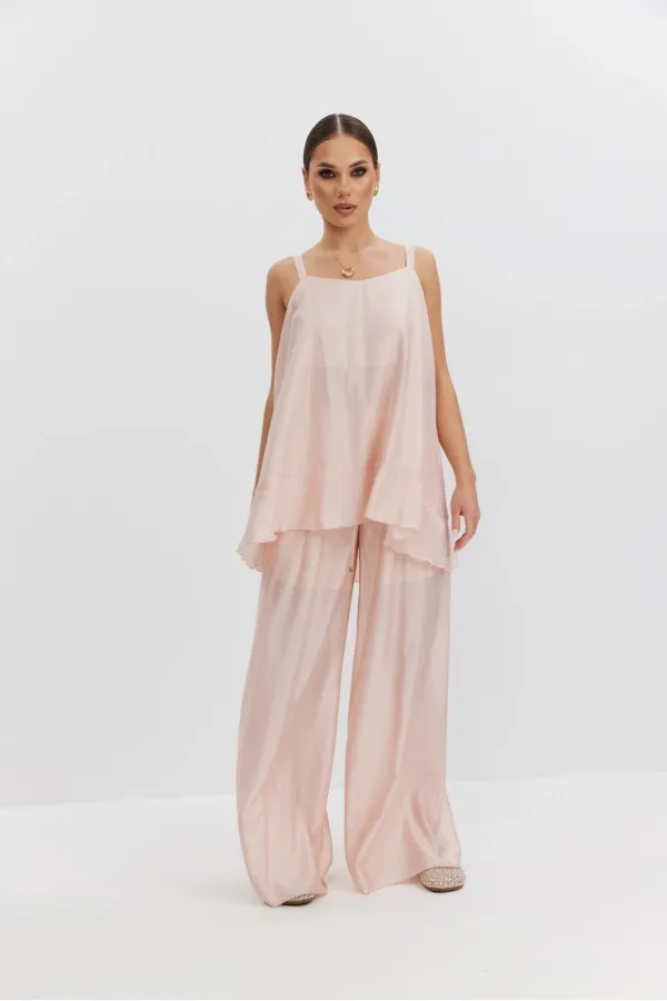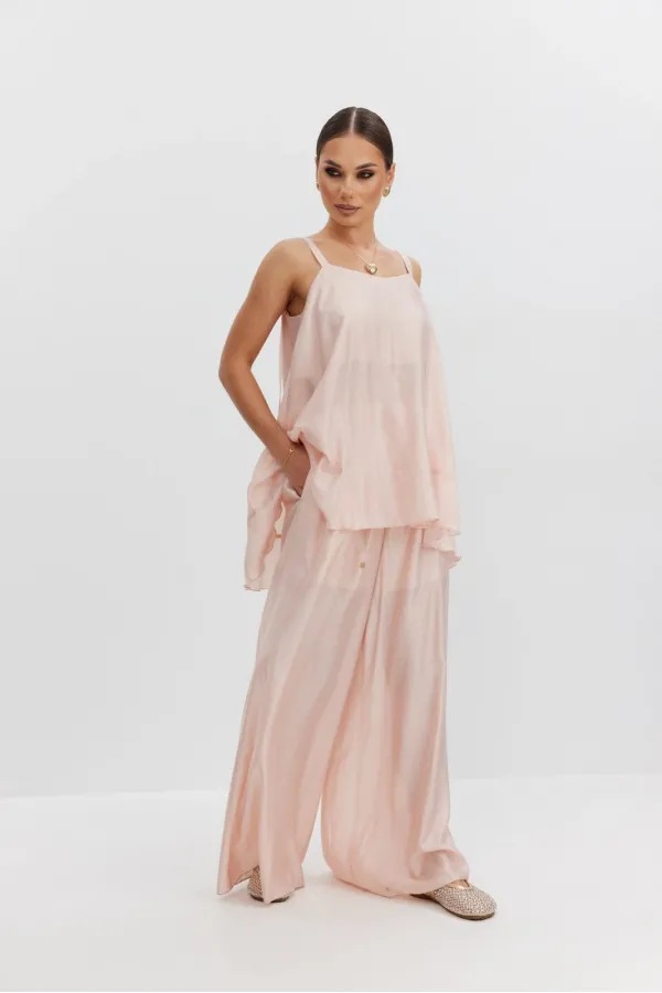 Брюки женские свободного силуэта из полупрозрачной ткани вуаль, высокая посадка, брюки на резинке, пояс притачной со шнуром, боковые карманы в швах. В брюках предусмотрена подкладка в виде шорт