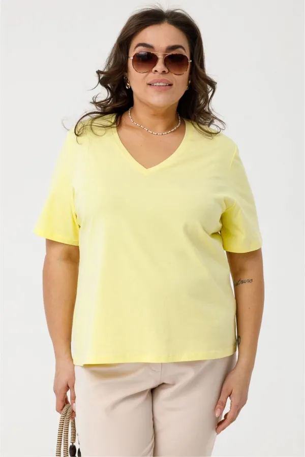 Жёлтая трикотажная футболка от компании Luxury plus. Комфортная футболка приталенного силуэта. V-образный вырез горловины обработан бейкой. Рукава короткие втачные. Низ изделия прямой. Модель отлично сочетается с джинсами, брюками или юбками. Комфортный вариант для жаркого лета!