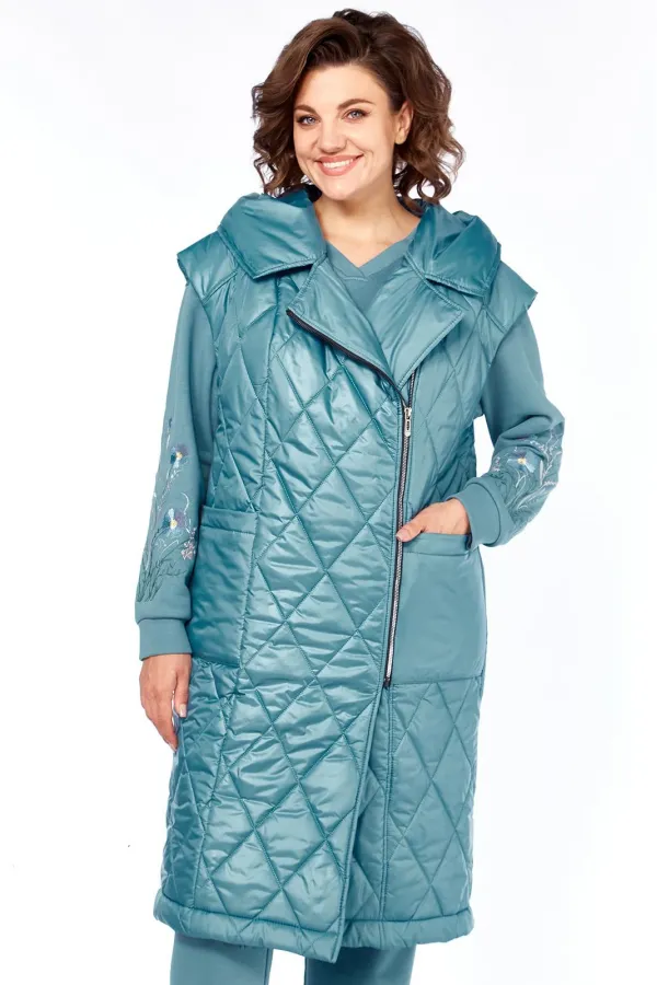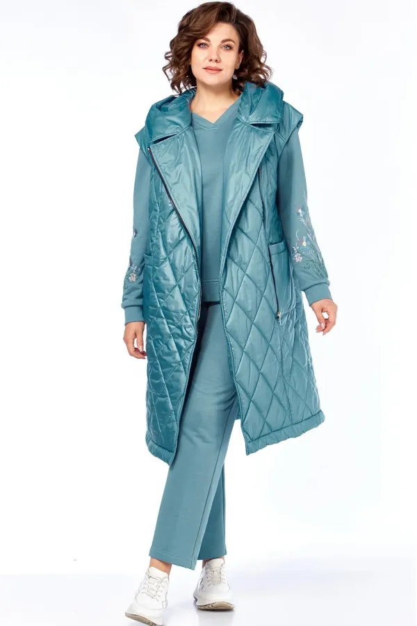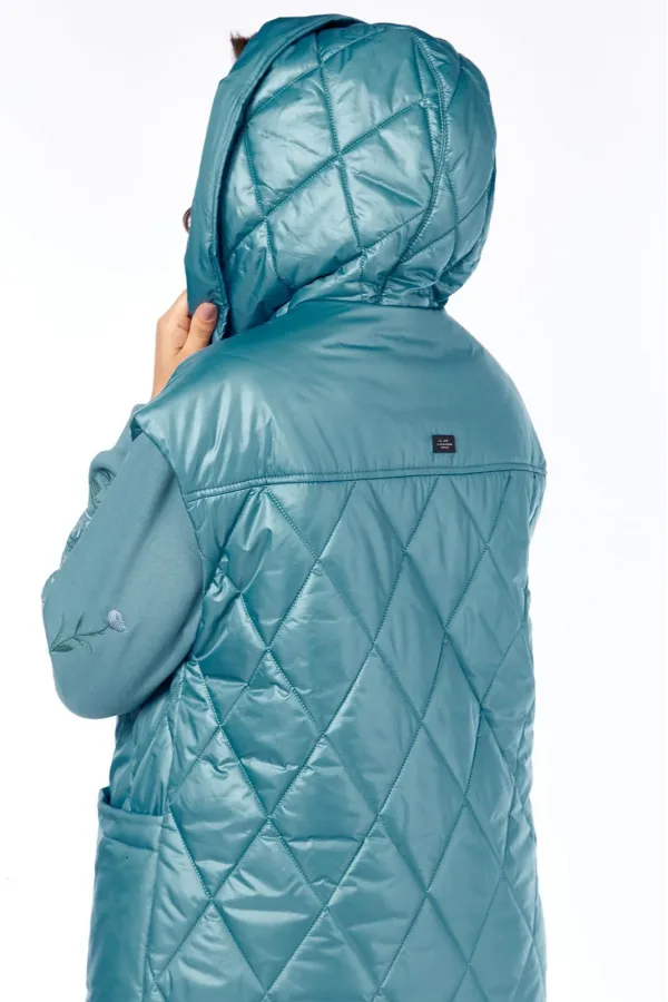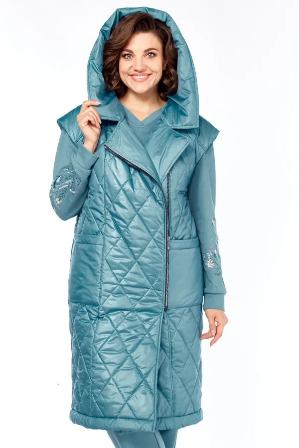 Жилет удлинённый со смещенной застёжкой на тесьму-молнию под металл . Перед с кокетками, переходящими на спинку,рельефами от них до низа и накладными карманами. Спинка цельная. Горловина обработана капюшоном.