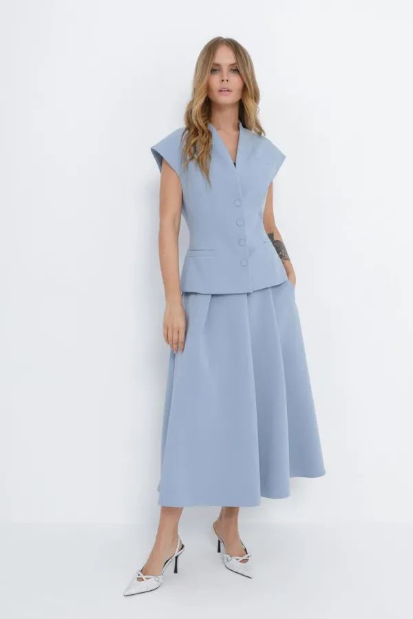 Детали: полуприлегающий силуэт, цельнокроеный воротник-стойка, рельефные швы переда и спинки, функциональные карманы, застежка на петли и пуговицы, жилет на подкладке.