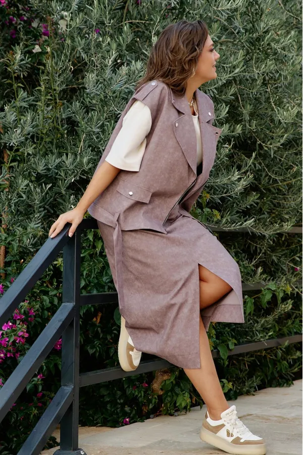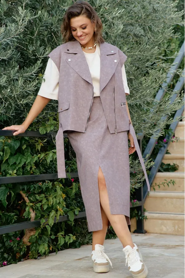 Жилет «оверсайз» силуэта, выполненный в стиле «косуха», удлинённый. Воротник пиджачного типа с отделкой декоративными кнопками по лацканам; ассиметричным бортом и застёжкой на тесьму молнию. По переду жилета декоративный... Читать далее...