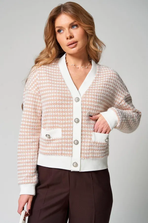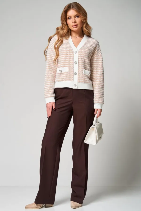 Застежка центральная на петли и пуговицы. На деталях переда накладные карманы с притачными планками, на которые прикреплены декоративные пуговицы. Рукава втачные одношовные длинные, с притачными манжетами. Линия плеча спущена. По низу кардигана, по краю борта и горловине - притачная планка.
