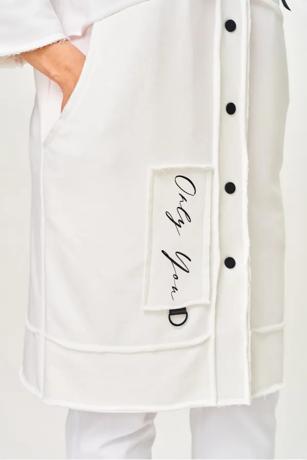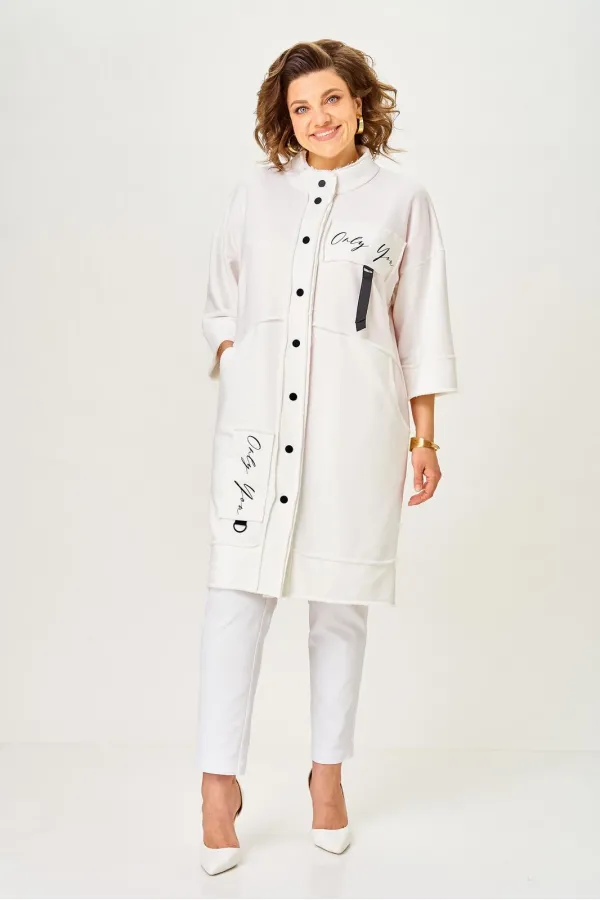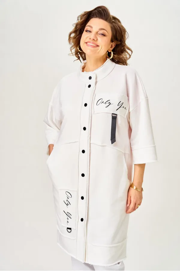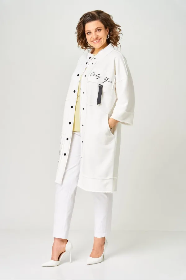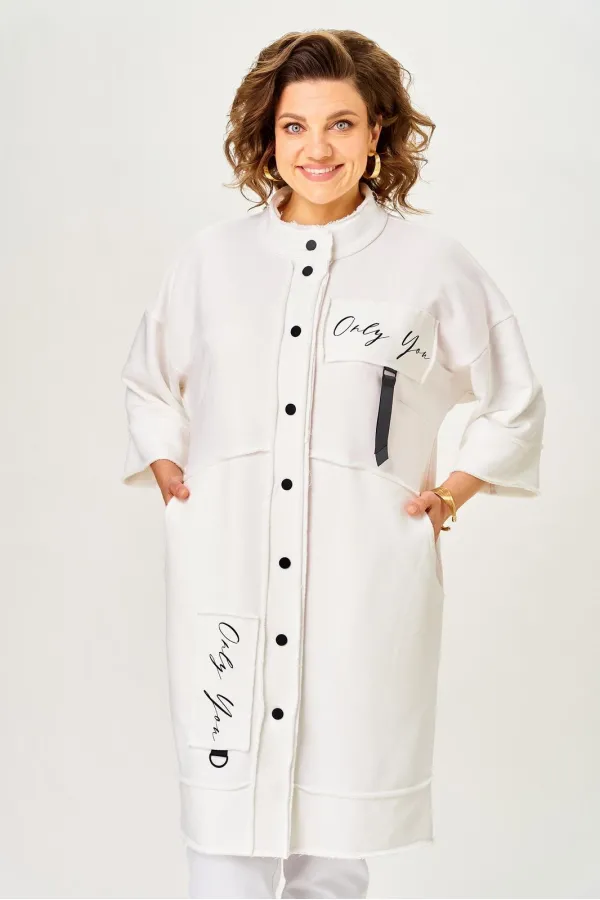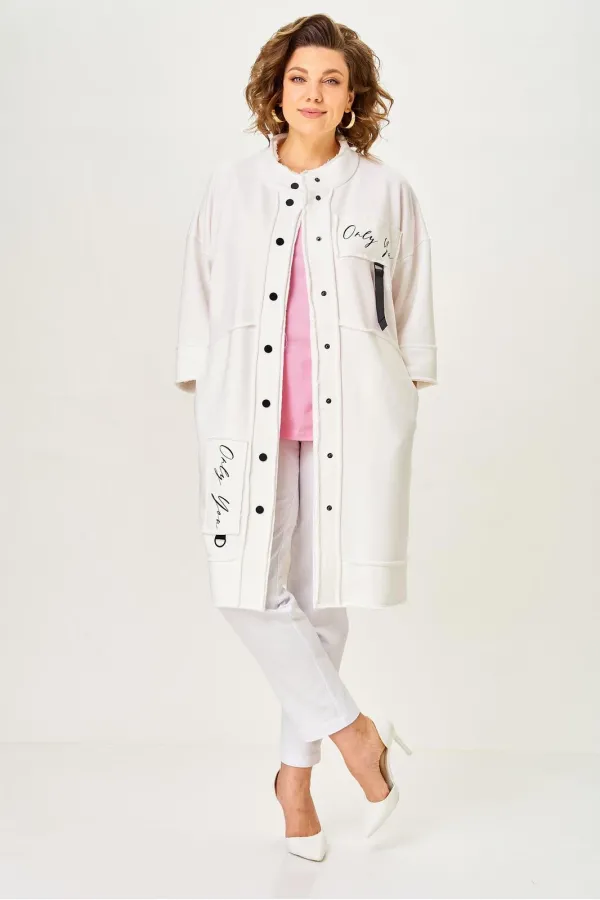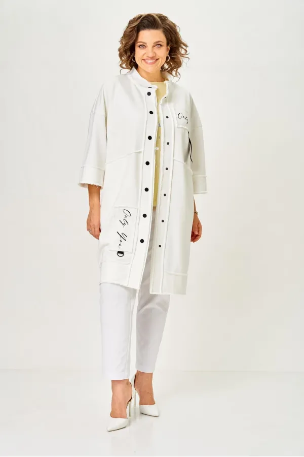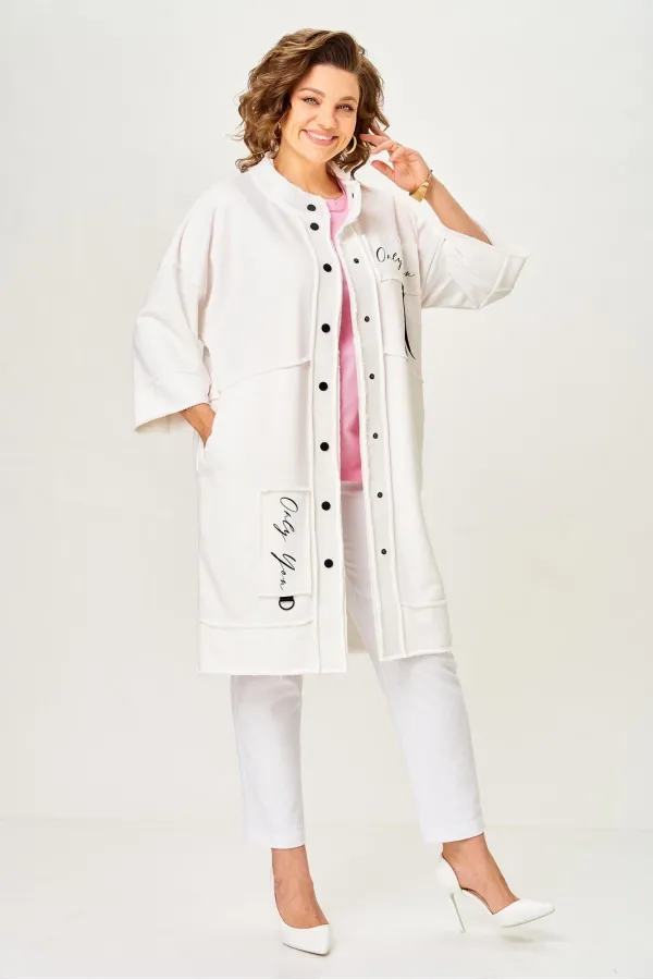 Кардиган женский прямого силуэта из трикотажной ткани (трехнитка-футер). На полочке и спинке расположены декоративные, необработанные швы. В верхней и нижней части переда есть настрочные элементы с печатью и тесьмой. П... Читать далее...