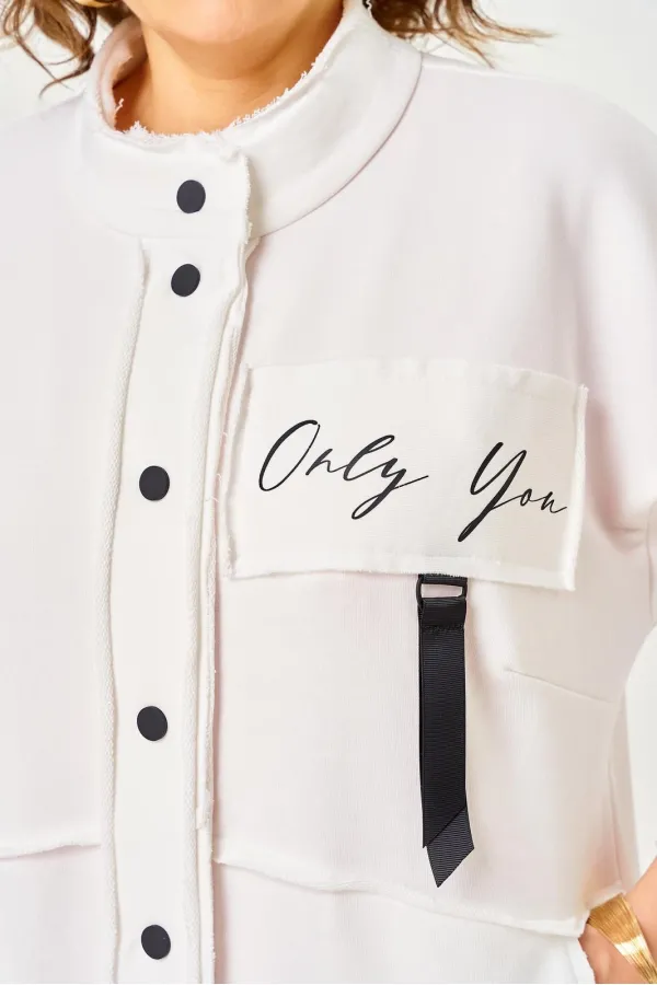 Кардиган женский прямого силуэта из трикотажной ткани (трехнитка-футер). На полочке и спинке расположены декоративные, необработанные швы. В верхней и нижней части переда есть настрочные элементы с печатью и тесьмой. По переду изделия карманы. Спинка со средним швом и кокеткой. На кокетке расположен элемент с печатью и тесьмой. Рукав спущенный с манжетой. Вырез горловины оформлен стойкой. По переду изделия планка с кнопками.