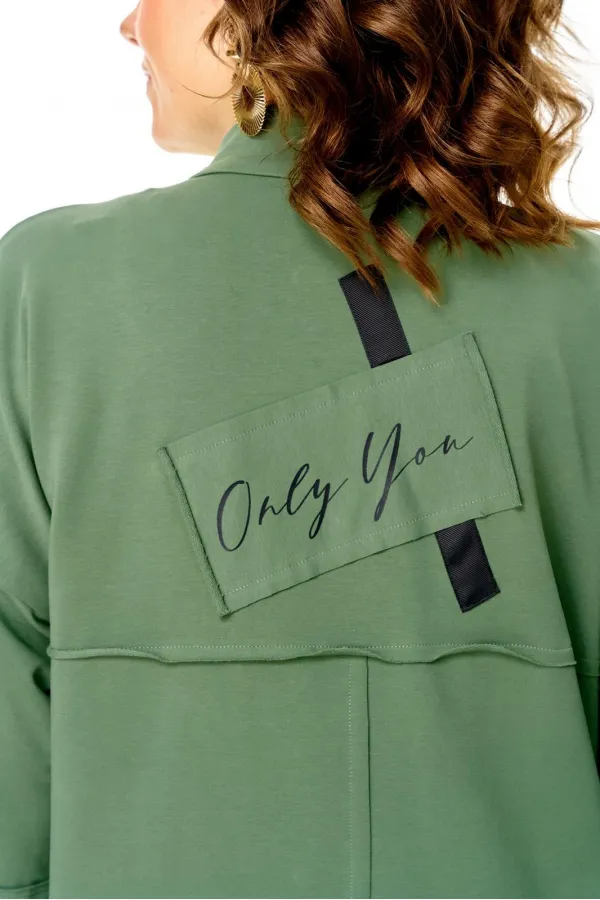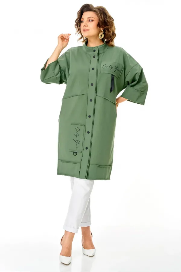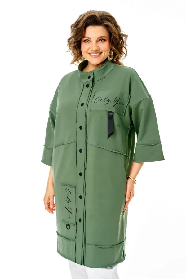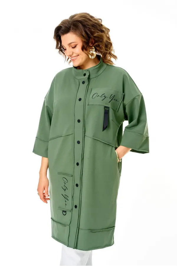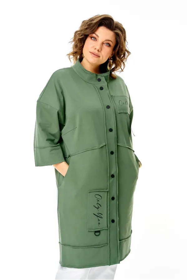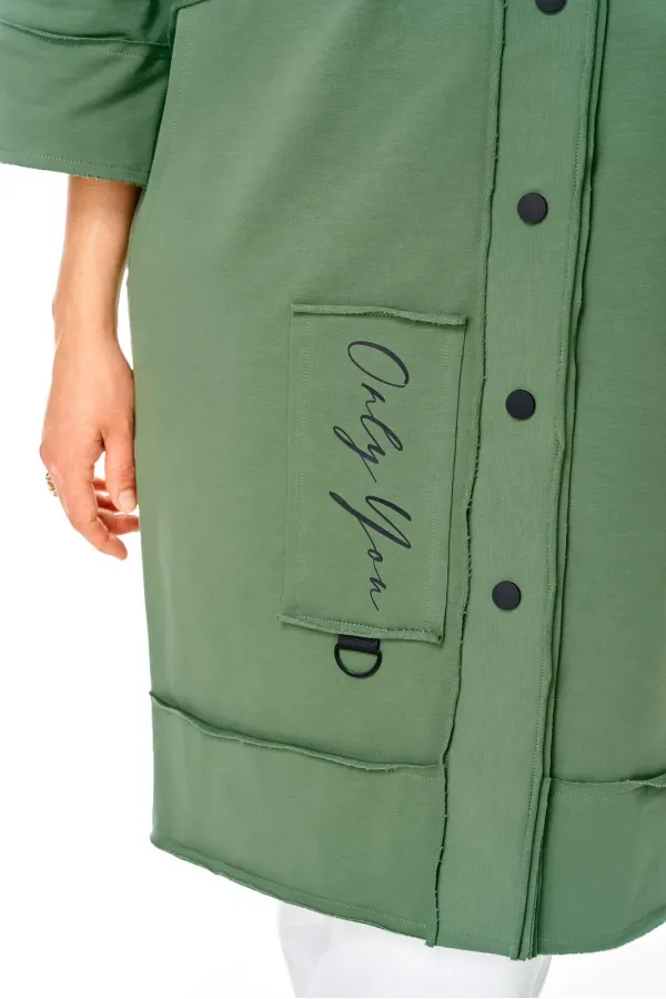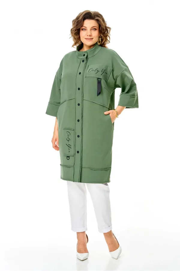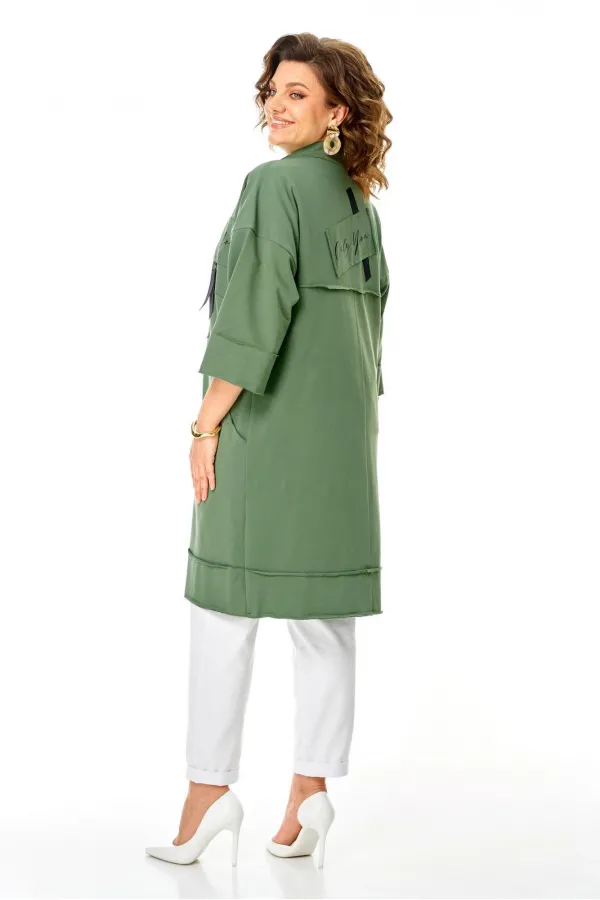 Кардиган женский прямого силуэта из трикотажной ткани (трехнитка-футер). На полочке и спинке расположены декоративные, необработанные швы. В верхней и нижней части переда есть настрочные элементы с печатью и тесьмой. По переду изделия карманы. Спинка со средним швом и кокеткой. На кокетке расположен элемент с печатью и тесьмой. Рукав спущенный с манжетой. Вырез горловины оформлен стойкой. По переду изделия планка с кнопками.