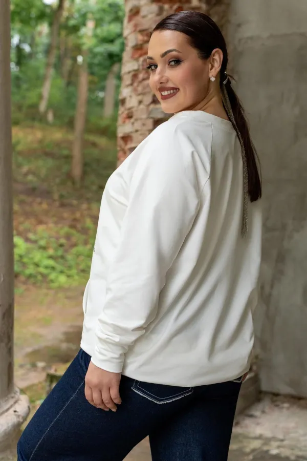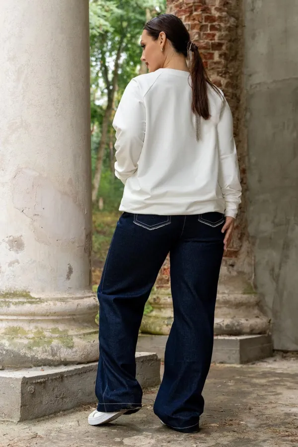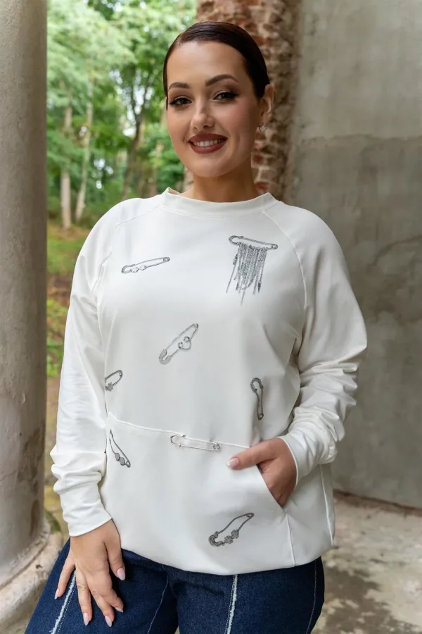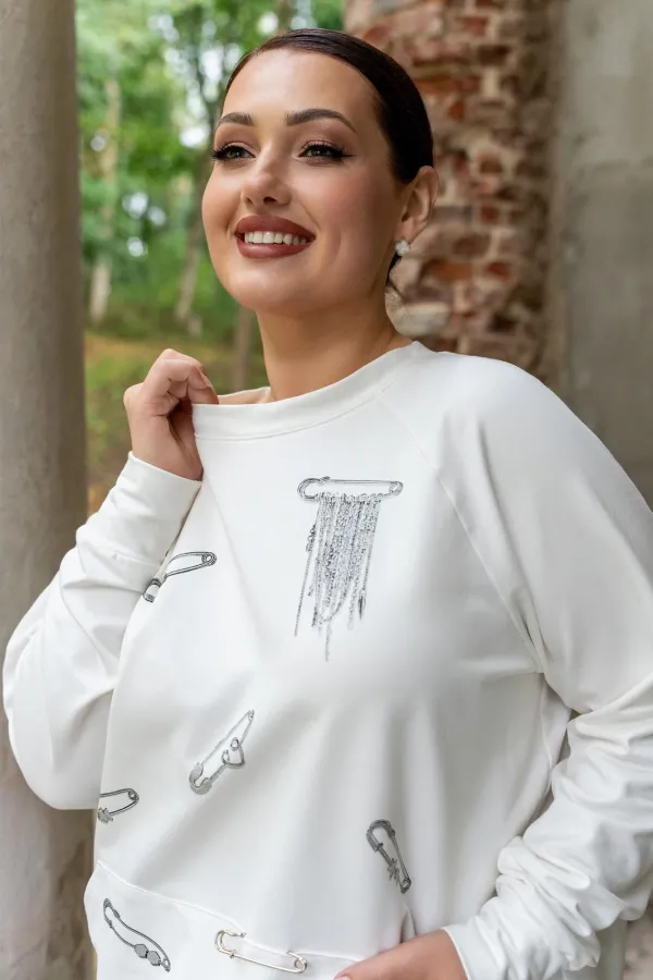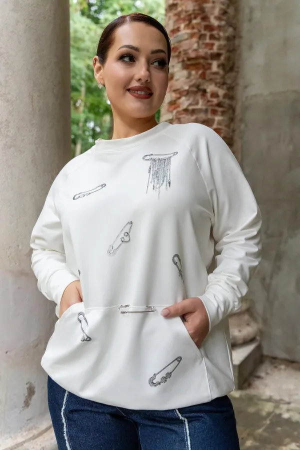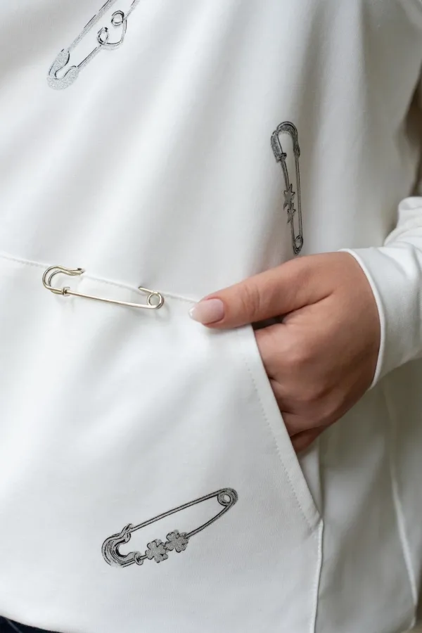 Этот стильный джемпер белого цвета выполнен из высококачественного материала, обеспечивающего комфорт при носке. Особенностью модели является оригинальный дизайнерский принт в виде булавок, расположенных на передней части. Дополнительный акцент на полочке - накладной карман, удобный для хранения мелких предметов. Джемпер обладает прямым кроем, что делает его универсальным вариантом для повседневного образа. Притачные рукава и манжеты добавляют изделию аккуратности и подчеркивают его качественное исполнение. Эта модель будет замечательным выбором для создания стильного и современного образа.