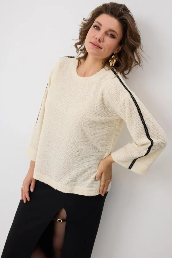 Нежный свитшот свободного кроя из фактурного трикотажа с вплетением мерцающих нитей в благородном оттенке топлёного молока - идеальный выбор для уютных и элегантных образов. Модель идеально впишется в Ваш гардероб, позволяя создавать множество современных сочетаний с жакетами, брюками, юбками и различной обувью.