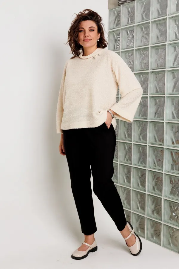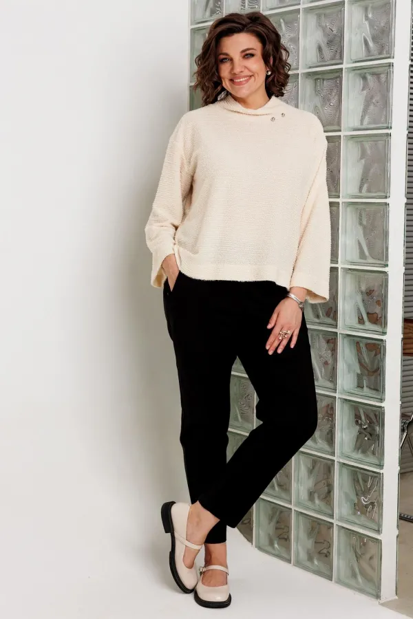Нежный свитшот свободного кроя из фактурного трикотажа с вплетением мерцающих нитей в благородном оттенке топлёного молока - идеальный выбор для уютных и элегантных образов. Модель идеально впишется в Ваш гардероб, позволяя создавать множество современных сочетаний с жакетами, брюками, юбками и различной обувью.
