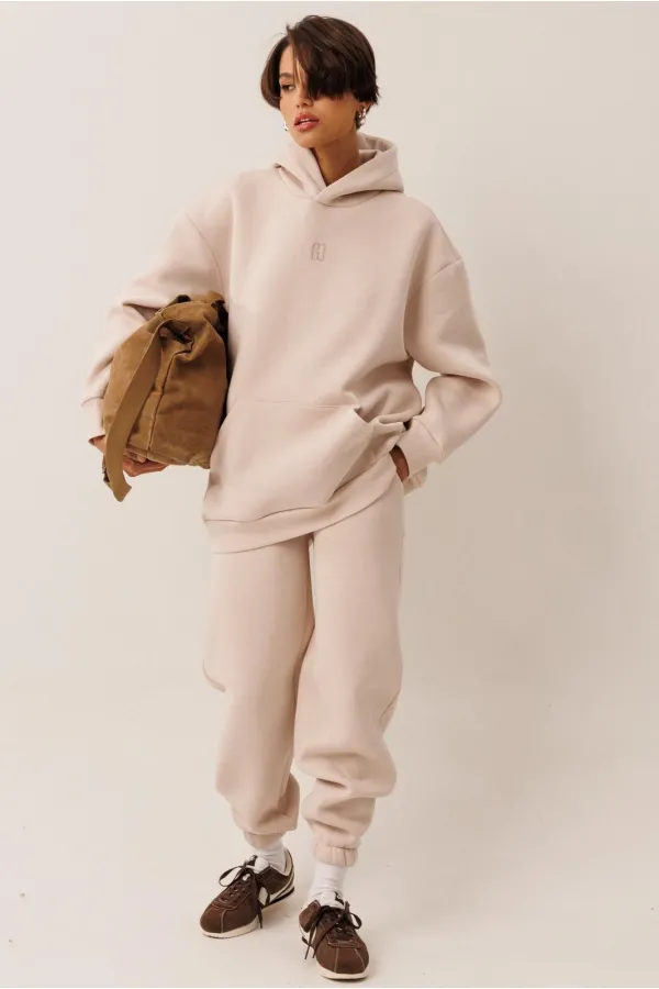Женский тёплый уютный костюм. Подойдет для прогулок и отдыха. Изготовлен из футера с начесом, состоит из худи, покроя оверсайз и джоггеров.