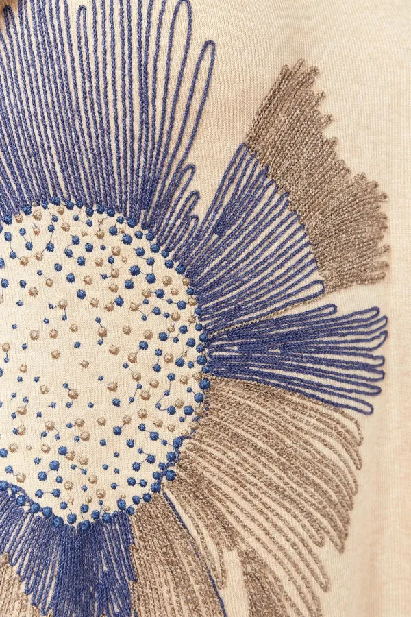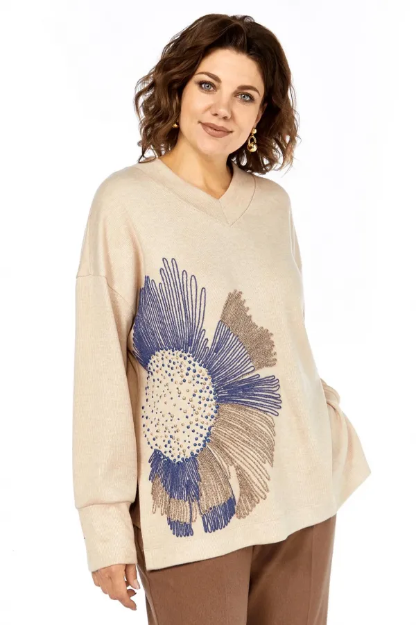 Джемпер свободного кроя, изготовлен из трикотажного полотна. Горловина V-образной формы. На полочке-вышивка. Спинка цельнокроенная. Рукава спущенные, с манжетами по низу. В боковых швах-разрезы.