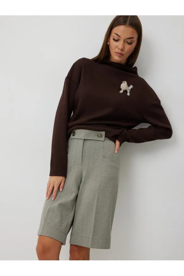 Блузон женский с цельнокроеной горловиной типа хомут. Линия плеча и проймы спущены. Рукав втачной, одношовный. Блузон декорирован авторской брошью. Декоративные элементы и фурнитура могут отличаться от заявленных на фот... Читать далее...