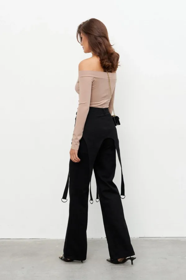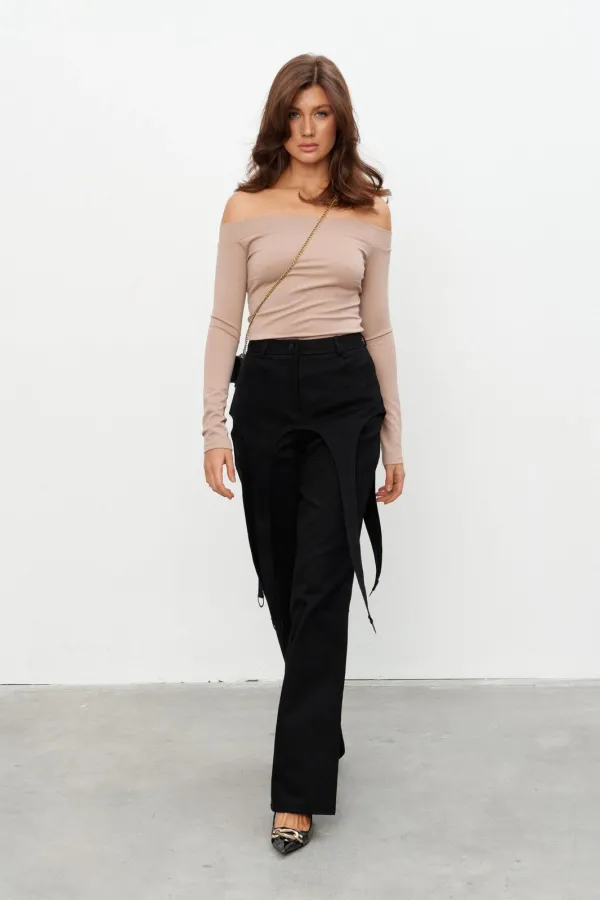 Джемпер из трикотажного полотна прилегающего силуэта с открытыми плечами. Отрезная деталь по верху изделия плотно фиксирует изделие на фигуре.