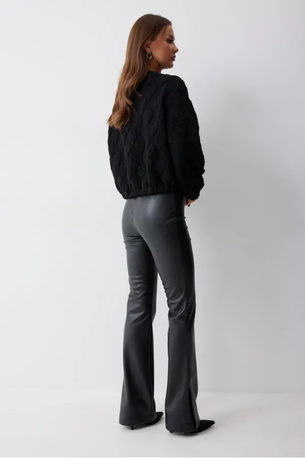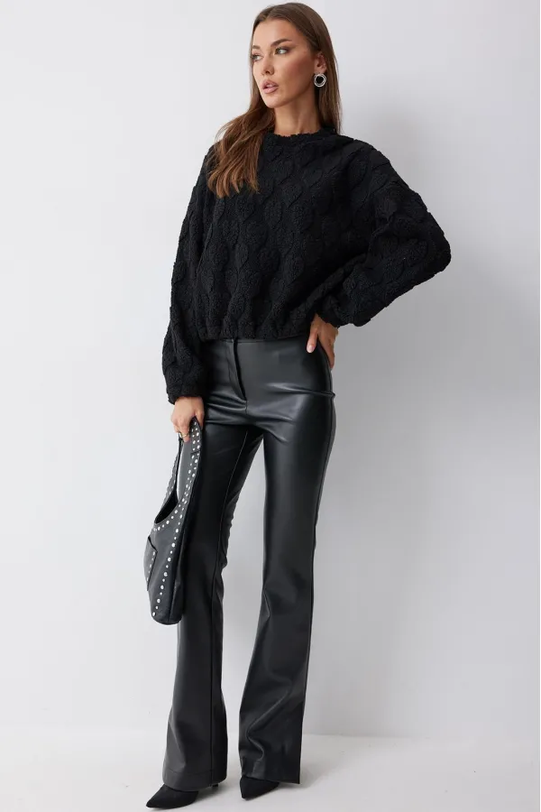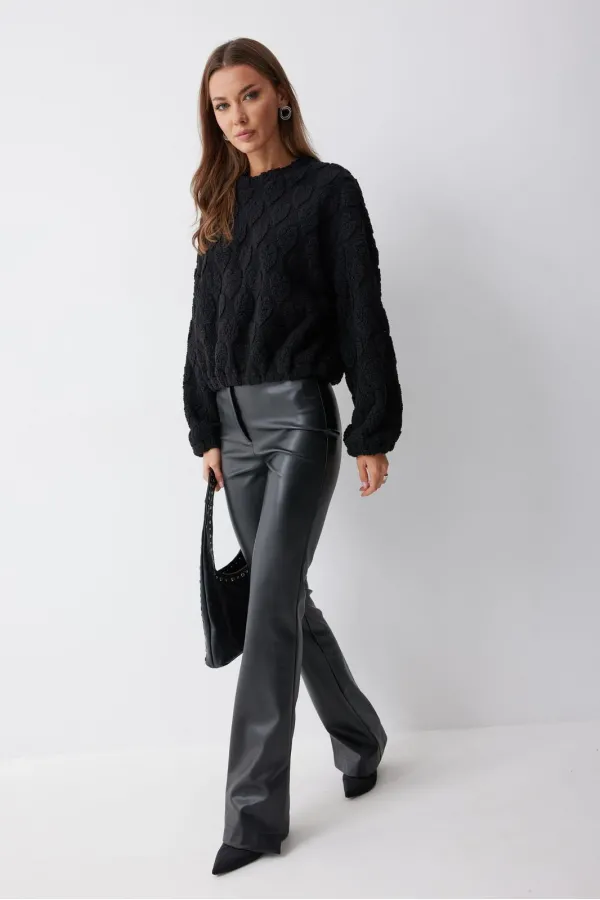 Укороченный джемпер прямого силуэта из трикотажного полотна. Горловина округлая. Рукав со спущенной линией плеча, по низу резинка. По низу джемпера резинка.