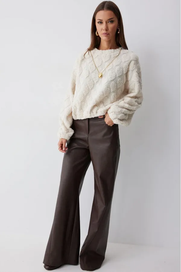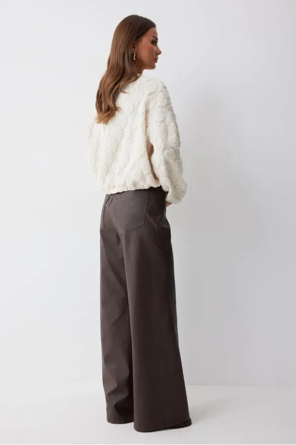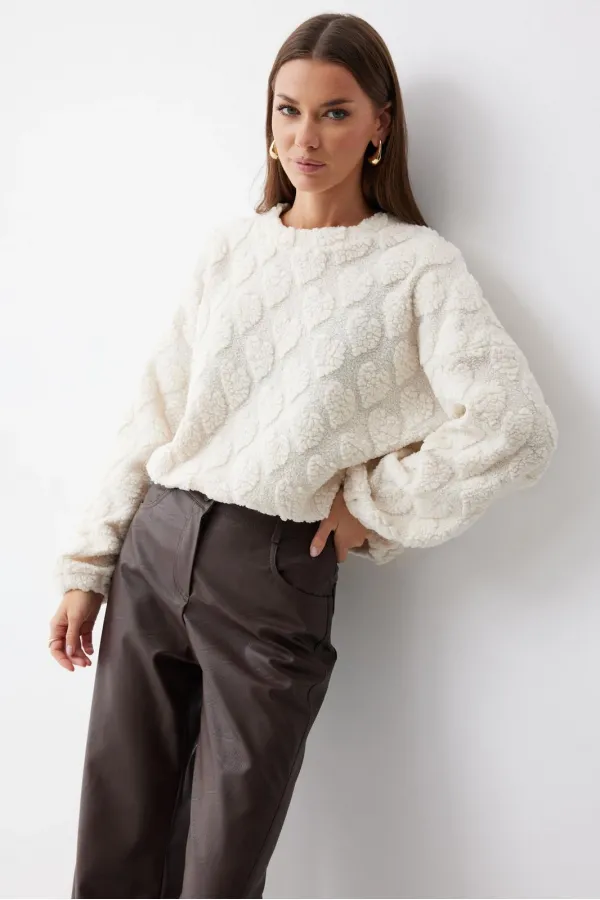 Укороченный джемпер прямого силуэта из трикотажного полотна. Горловина округлая. Рукав со спущенной линией плеча, по низу резинка. По низу джемпера резинка.