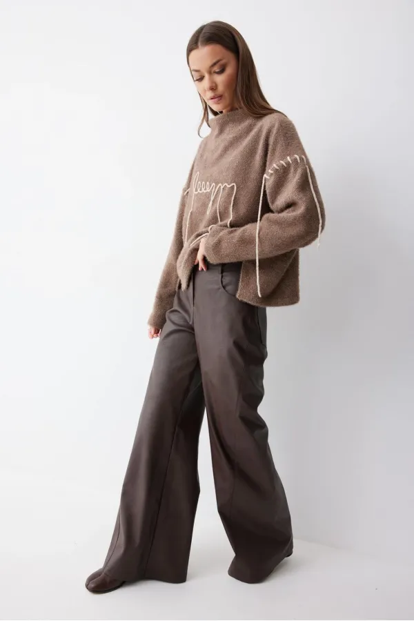 Джемпер прямого силуэта из трикотажного полотна с фигурным низом. Горловина цельнокроеная стойка. Рукав со спущенной линией плеча, удлиненный. Джемпер со смещенным боковым швом. По переду джемпера дизайнерская вышивка.